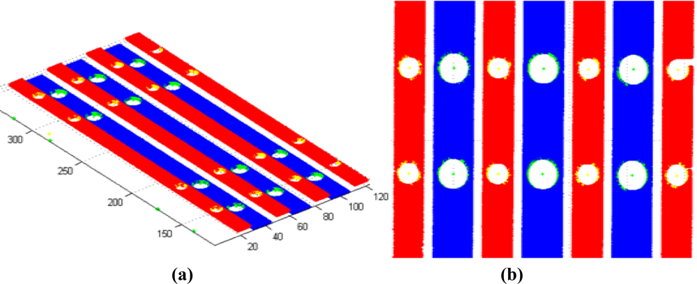As it is mentioned in Section 3, the displacement and the direction of the MLS has to be taken into account to an appropriate surface reconstruction from the laser line points of each image. For each point in image identified as a surface point, the coordinates in the frame of the LTS have to be calculated and after that, the translation T has to be applied as shown in (15):