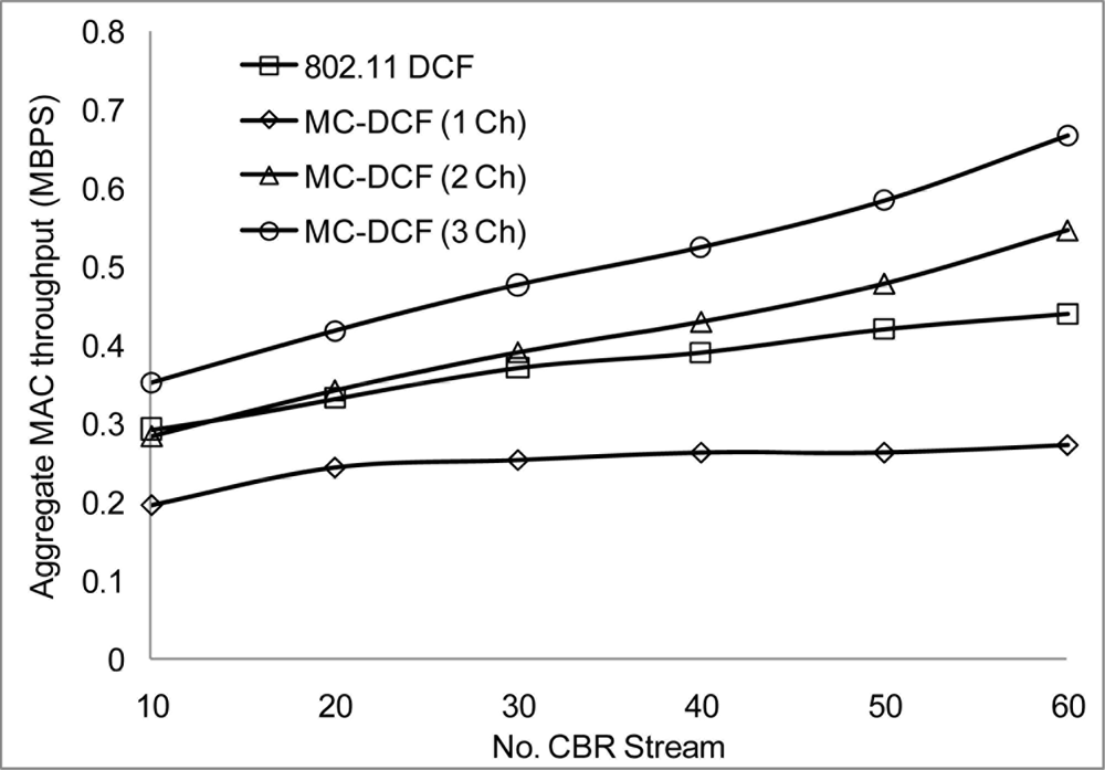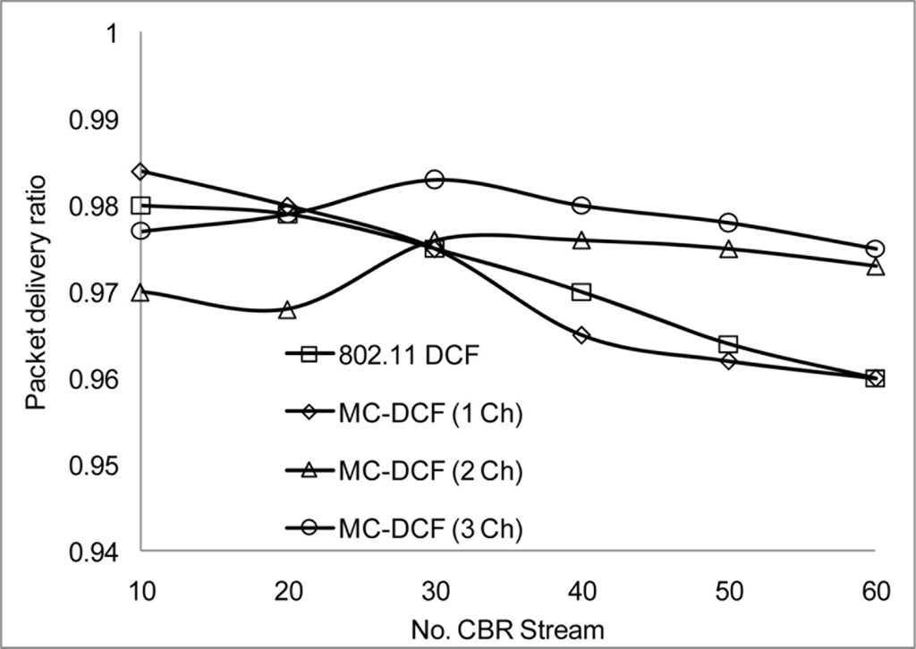 Figure 10 shows that the delivery ratio when 3 channels are used have more packets delivered compared to 1 and 2 channels. Having 1 channel as can be seen in 802.11 DCF and MC-DCF (1 Ch), experience constant degradation as the CBR streams increases. This degradation results in constant backing off where nodes are contending for the same channel with results in more packet loss. In Figure 11, a similar trend is seen where MC-DCF with 3 channels has a better aggregate throughput, where more data are deliver to the receiving node. MC-DCF with single channel performs worse with more unsuccessful attempts having less data delivered to the receiving node. This showed that with the modification to the backoff algorithm where nodes have an option to switch channel, if this procedure remained while using a single channel, backing off becomes more frequent as the threshold is reached much quicker. In using a single channel the original 802.11 DCF performed better than the MC-DCF single channel, the original DCF had the option of reaching the maximum CW window size before entering wait state.