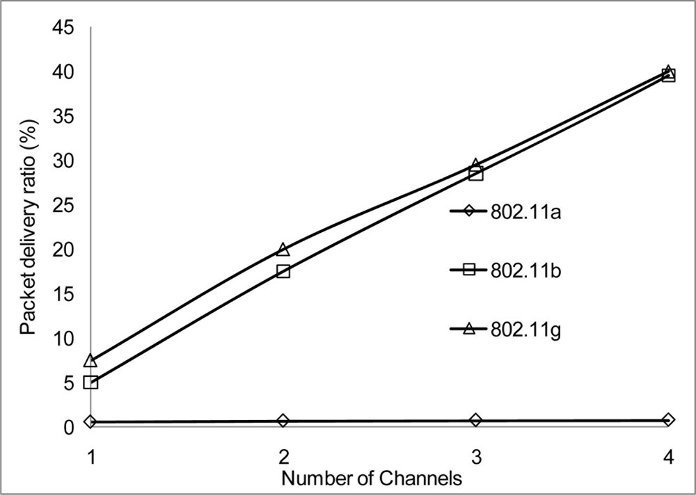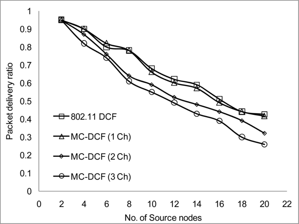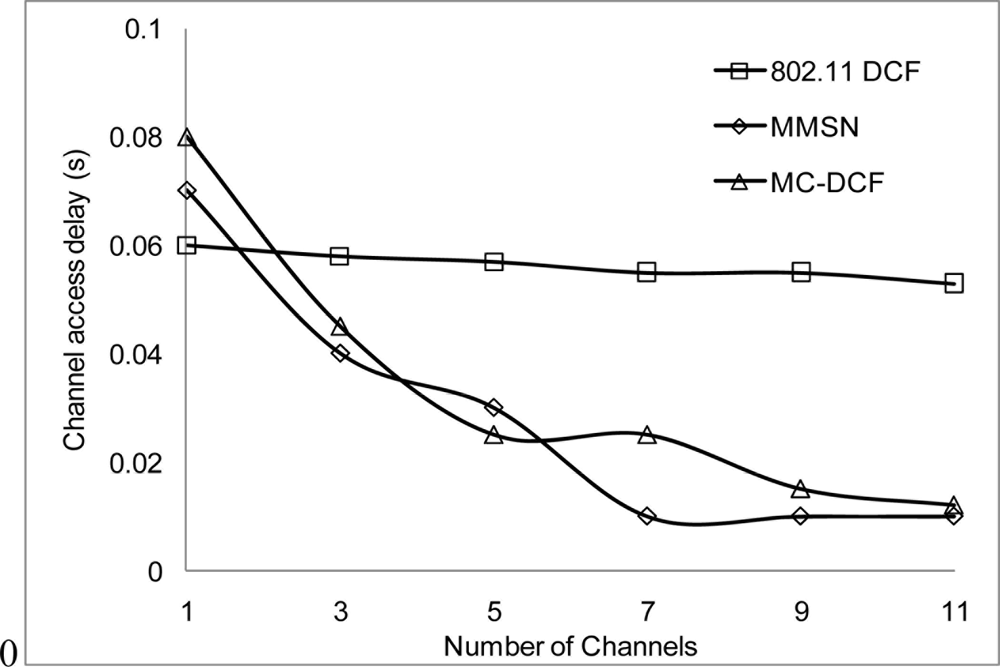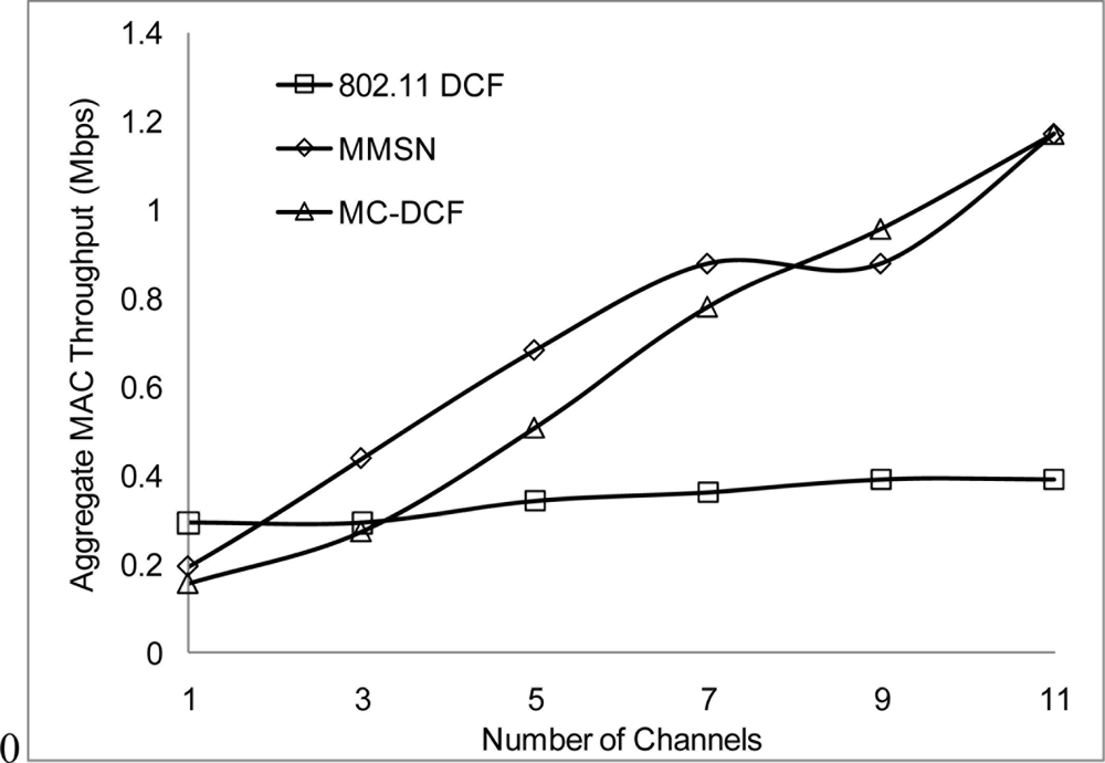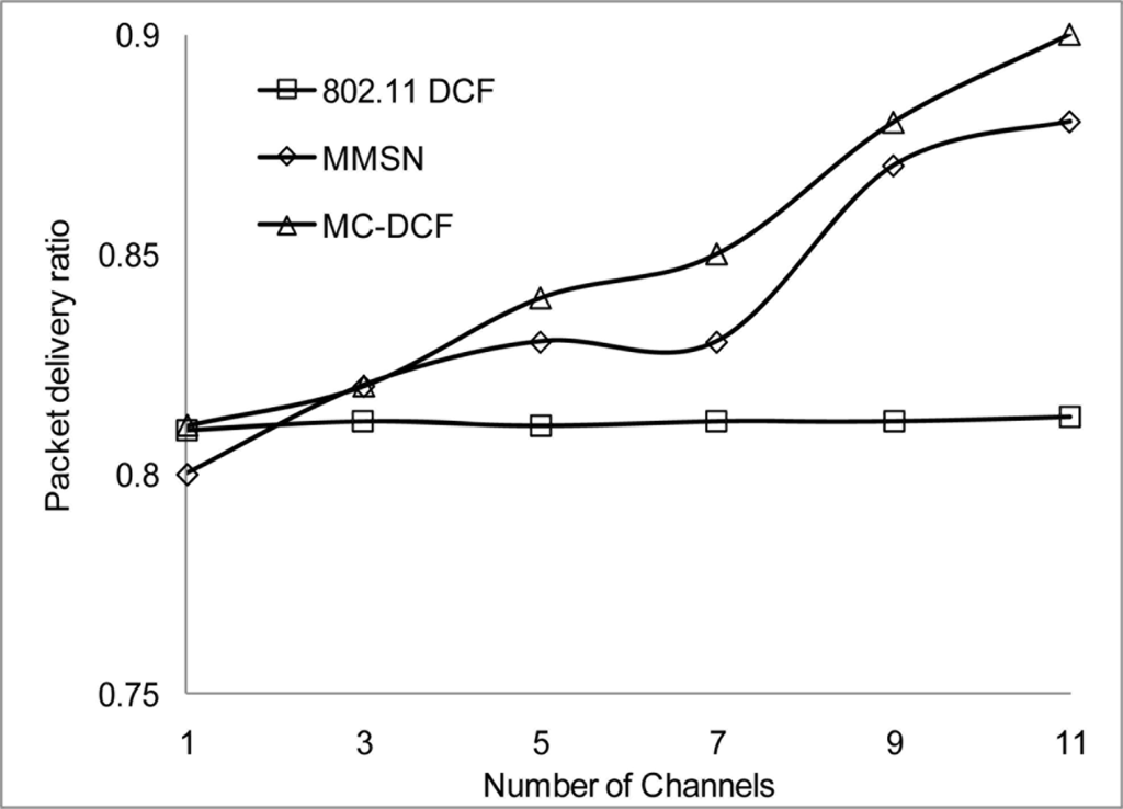 In Figures 6, 7, and 8, we analyzed the performance of the number of channels on the 3 mentioned metric against MMSN [25]. Zhou et al. introduced the MMSN multi-frequency MAC protocol that was designed for WSN. It is a slotted CSMA protocol and at the beginning of each timeslot nodes need to contend for the medium before they transmit. We observed that channel access delay and aggregate throughput show MMSN perform slightly better than MC-DCF. MMSN uses a small packet size of 30–50 bytes, which contribute to the performance observed. This gives evidence that MC-DCF will outperform MMSN in the 802.11 network, should both protocols operate within the data rate (from 2 Mbps up to 54 Mbps) of the 802.11 networks. 802.11 DCF does not show much variation as this protocol only operates on a single channel. In Figure 8, MC-DCF showed a better performance in packet deliver ratio to that of MMSN. This is due to the fact that the advantage of higher data rate has more packets delivering and receiving by each node.
