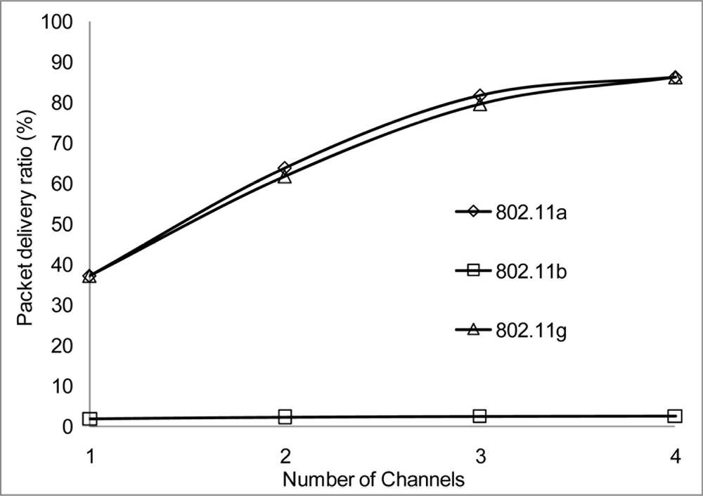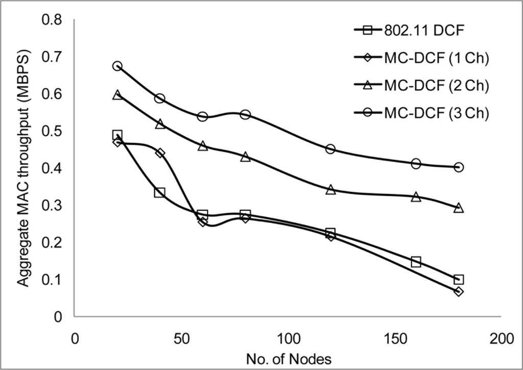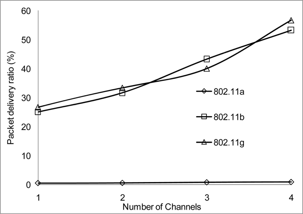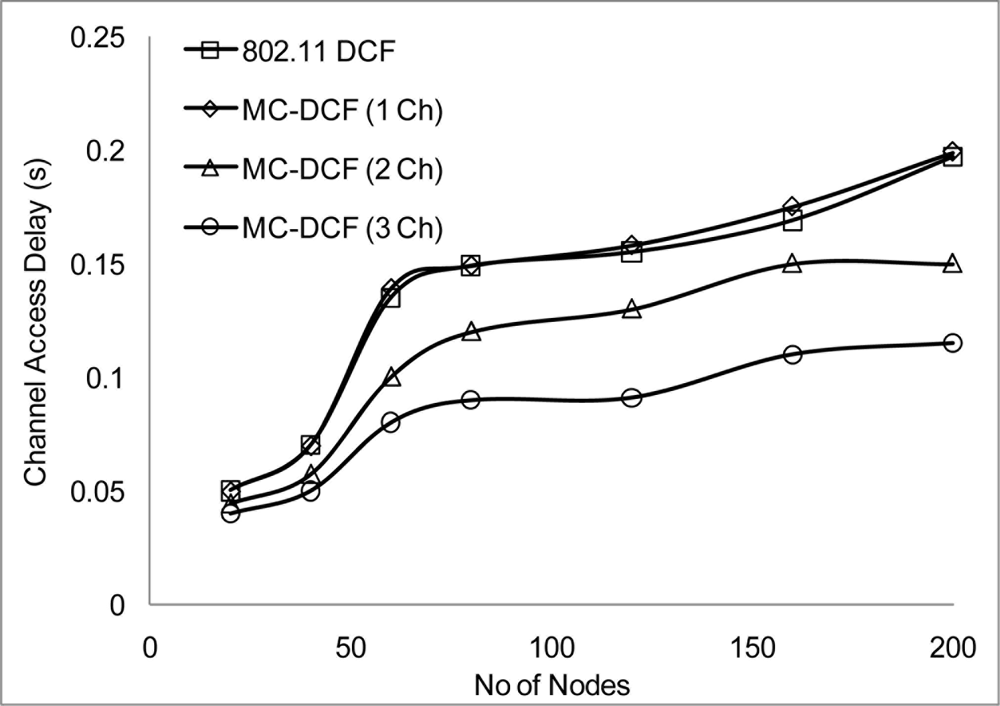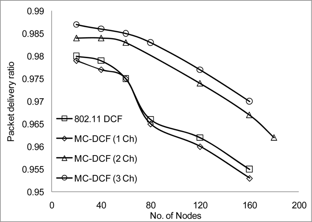 In Figures 6, 7, and 8, we analyzed the performance of the number of channels on the 3 mentioned metric against MMSN [25]. Zhou et al. introduced the MMSN multi-frequency MAC protocol that was designed for WSN. It is a slotted CSMA protocol and at the beginning of each timeslot nodes need to contend for the medium before they transmit. We observed that channel access delay and aggregate throughput show MMSN perform slightly better than MC-DCF. MMSN uses a small packet size of 30–50 bytes, which contribute to the performance observed. This gives evidence that MC-DCF will outperform MMSN in the 802.11 network, should both protocols operate within the data rate (from 2 Mbps up to 54 Mbps) of the 802.11 networks. 802.11 DCF does not show much variation as this protocol only operates on a single channel. In Figure 8, MC-DCF showed a better performance in packet deliver ratio to that of MMSN. This is due to the fact that the advantage of higher data rate has more packets delivering and receiving by each node.