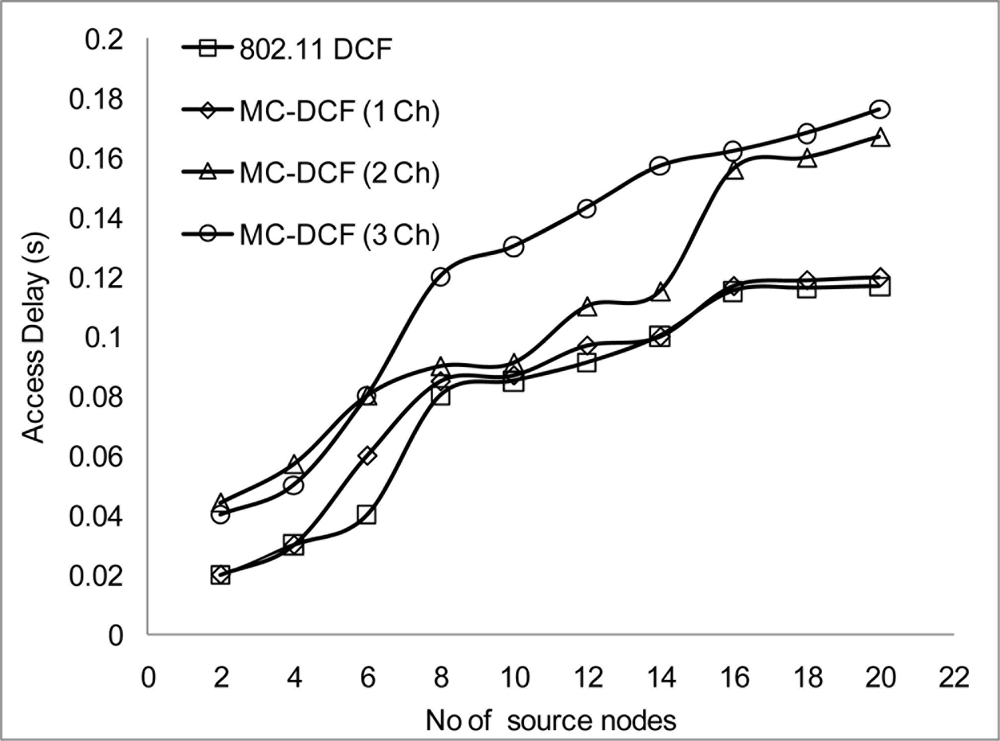 The access delay is the backoff time used in DCF [14], the access delay can also be calculated as the packet size × 8 (1 byte) divided by the link size plus the propagation delay that is