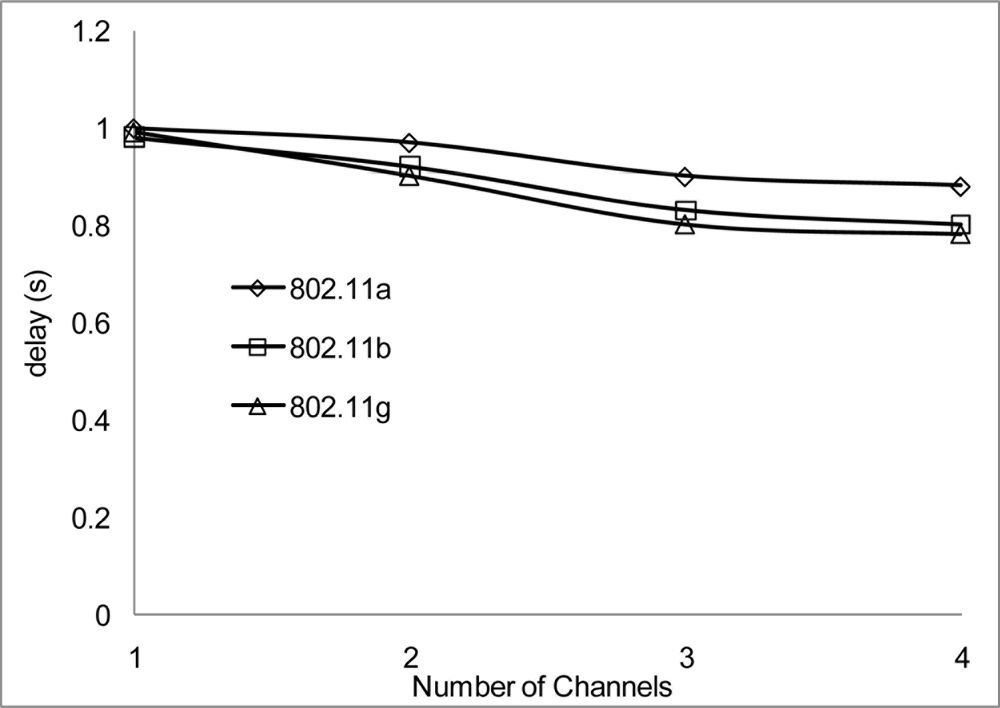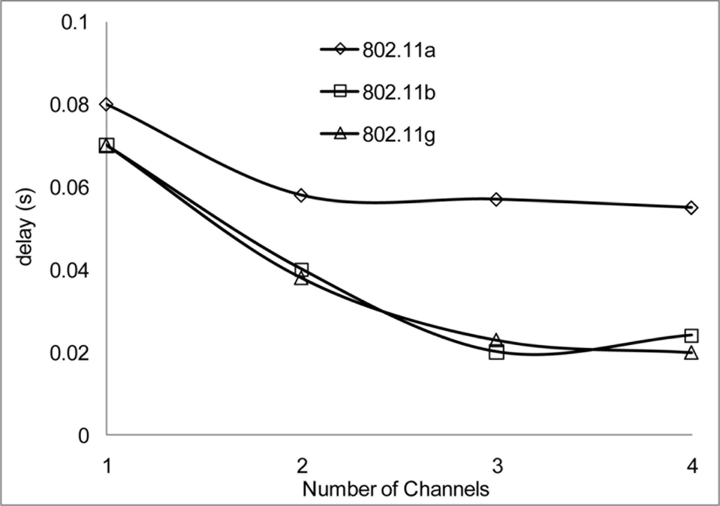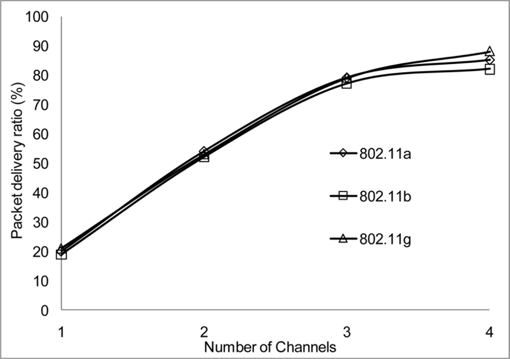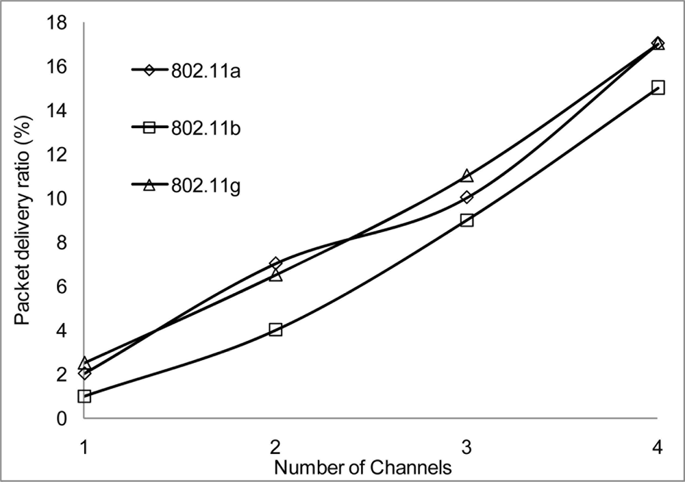 The packet delivery ratio and the aggregate throughput in Figure 13 and Figure 14 respectively show a better performance when 2 or more channels are used. Although there is a better performance using 2 or more channels, the more nodes transmitting packets through the network, the performance starts degrading. This is not unusual as nodes will be switching channels, backing off and entering wait state which is the norm in a contention base network. However, from Figure 13, the system performance is still within limit to transmit streaming data for WSN within the 802.11 network. An average of approximately 2.1% degradation of packet delivery ratio is experienced with a total of 97% delivery ratio for 3 channels. The aggregate throughput as a function of the offered load for 3 channels showed a throughput decrease of 14%.