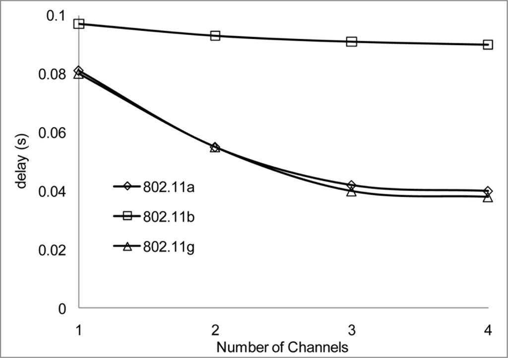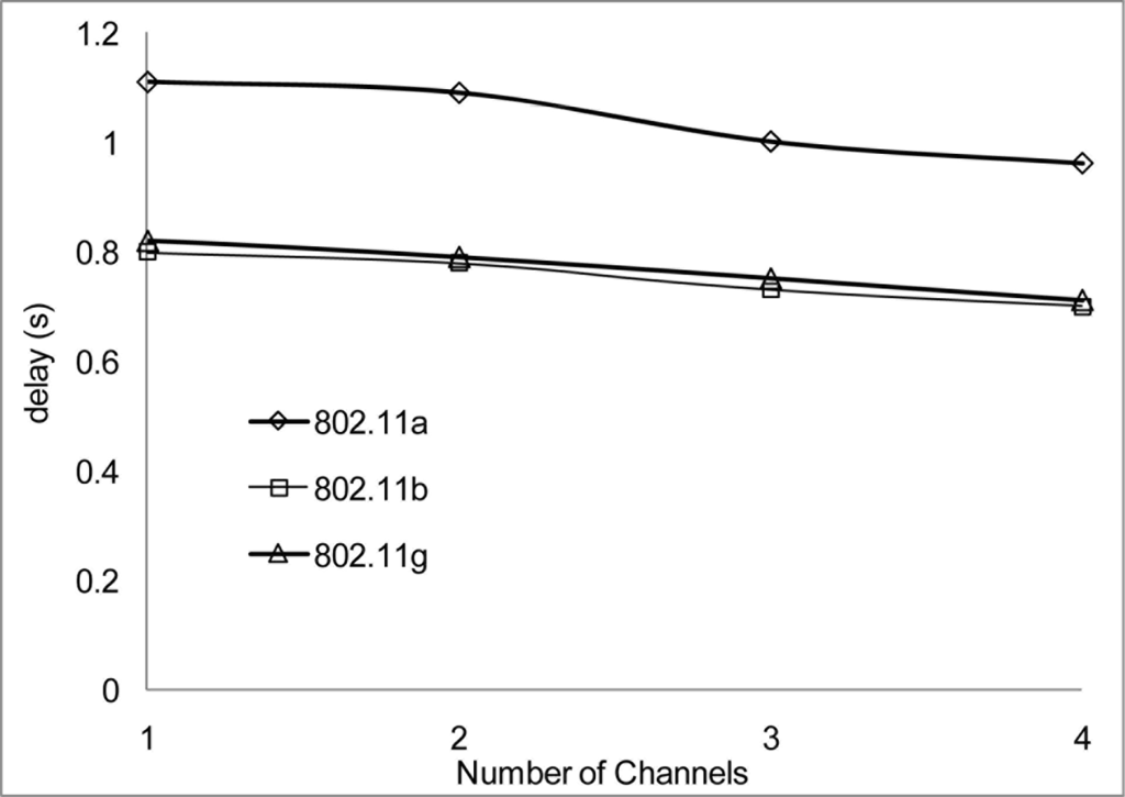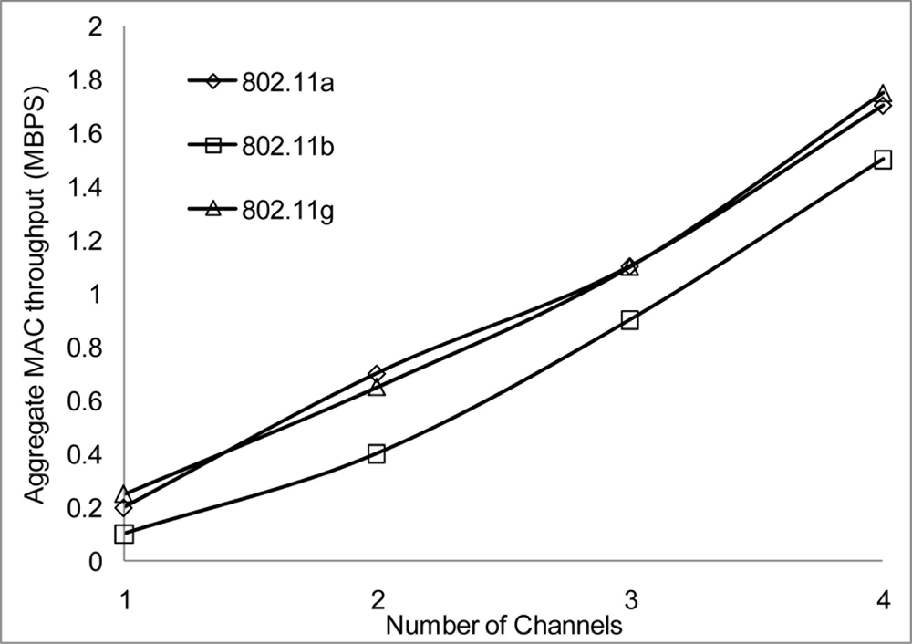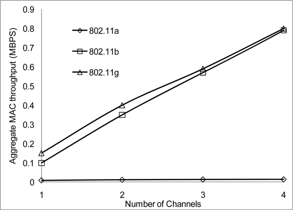 In our simulation scenarios, we will consider sensor nodes placed in a 1,000 × 1,000 m2 areas, the radio range and radio bandwidth with each scenario in order to determine suitable signal strength when operating in the 802.11 network for WSN. The number of nodes is 100 and the number of non-overlapping channels is 4 using the UK 2.400–2.4835 GHz frequency band. We configured the proposed MC-DCF MAC protocol to operate with the 802.11 a/b/g network for channel assignment and switching the multichannel. We will be analyzing the impact on 802.11 a/b/g and the radio range.