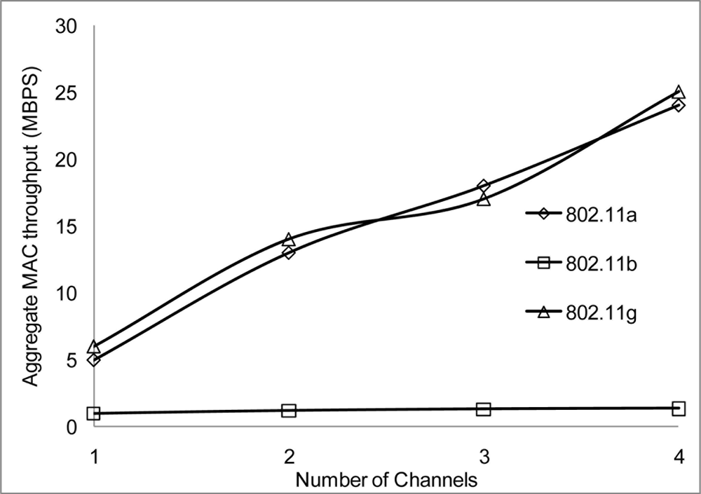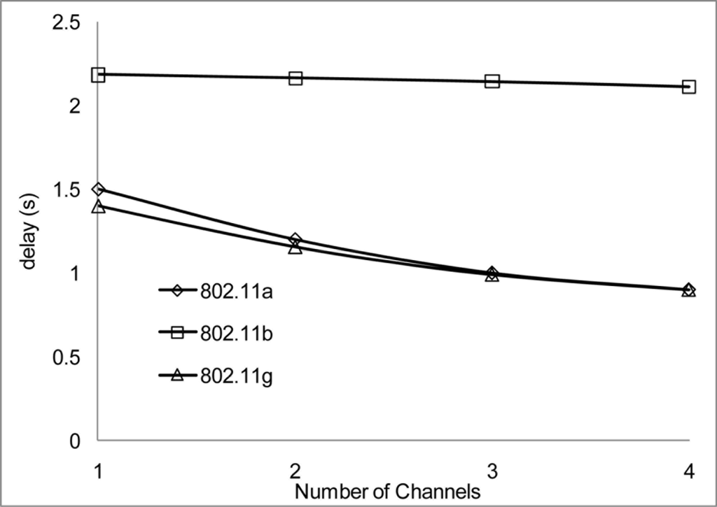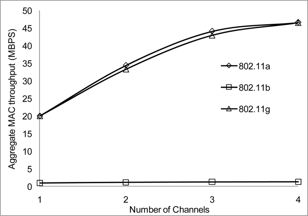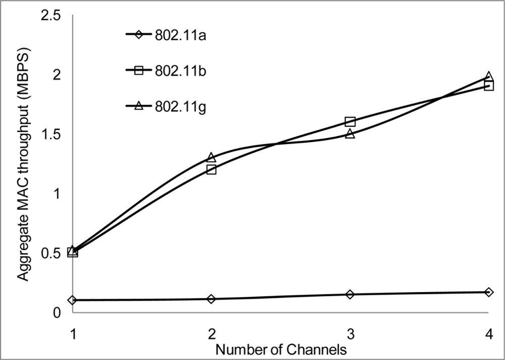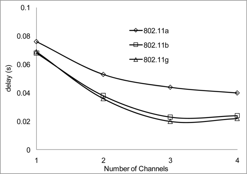 In our simulation scenarios, we will consider sensor nodes placed in a 1,000 × 1,000 m2 areas, the radio range and radio bandwidth with each scenario in order to determine suitable signal strength when operating in the 802.11 network for WSN. The number of nodes is 100 and the number of non-overlapping channels is 4 using the UK 2.400–2.4835 GHz frequency band. We configured the proposed MC-DCF MAC protocol to operate with the 802.11 a/b/g network for channel assignment and switching the multichannel. We will be analyzing the impact on 802.11 a/b/g and the radio range.