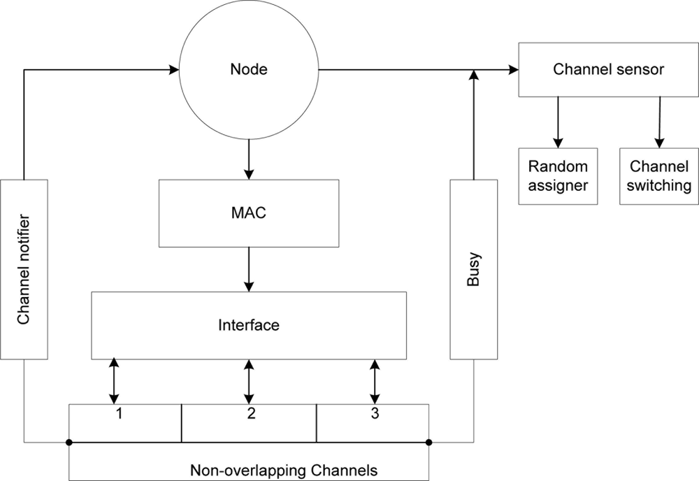In Figure 2 during initialization of the network, the channel notifier uses combined functions from the management system in order to obtain information regarding the number of interfaces at the upper layer by invoking a logical communication with the distribution system medium (DSM) [14] at the MAC sub layer. The channel notifier will assume that all nodes are in the same basic service set (BSS) and broadcast all the available channels within the BSS. The random assigner and channel switching is under control of the channel sensor that references the channel notifier. The sensor invokes the random assigner after the channel notifier updates nodes of all channels on the network. The assigner keeps a count of interfaces from which a uniform distribution algorithm mandates the proportionality for each channel i.e., how many interfaces to a channel. The random assigner randomly assigns interfaces to channels during the initialization process. Each node keeps updated information of its neighbors on the same channel within range by sensing the medium periodically and learning about the medium through the virtual carrier sense mechanism [14]. The CS also determines the busy/idle state of the medium.