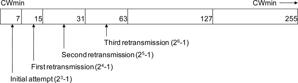 When a station (STA) wishing to transmit and sense busy, the CW shall take the next value in series every time an unsuccessful attempt to transmit causes the STA retry counter to increment. The channel sensor shall maintain a retry counter and after the define threshold is reached; it will invoke the channel switching parameter. Figure 3 shows the contention window with the define threshold 26-1.