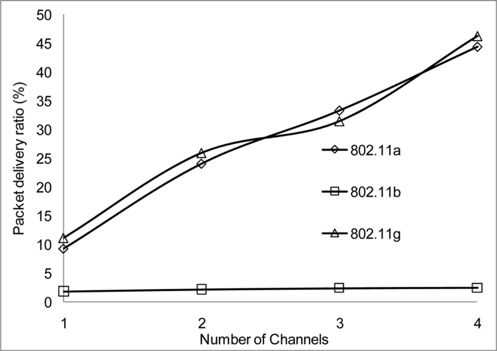 The packet delivery ratio results are shown below in Figures 30–35 as a function of the number of 4 overlapping channels. The results are similar to that of the aggregate throughput, in that, the more channels involve for transmission, the more packets are delivered. More packets are delivered when the range 50 m, at 10 Mbps in Figure 32 all networks delivered almost similar number of packets ranging between 20–87% delivery rates.