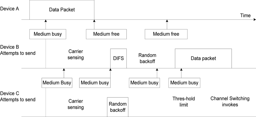 In Figure 4, if node A is transmitting a data packet and node B senses that the medium is busy and waits, after the initial attempt of waiting to transmit it senses the medium on the channel being used, attempts on the first retry and detects that the medium is free of other transmissions. The node waits for a predetermined DIFS (distributed inter-frame spacing) period, once it senses no other transmission before the end of the DIFS period, it computes a random backoff time between values of CWmin and CWmax then commences its transmission. Node C senses the medium to be busy and makes repeated attempts to transmit a packet; the computed backoff period is doubled with each attempt until the specified threshold is reached. When the threshold is reached the channel sensor invokes the channel switching. The node interface will tune to another channel, senses if the medium is busy. If busy, it will switch otherwise it will proceed with transmission. If all channels are busy the node will revert to random backoff time and set its backoff timer using the equation in [14].