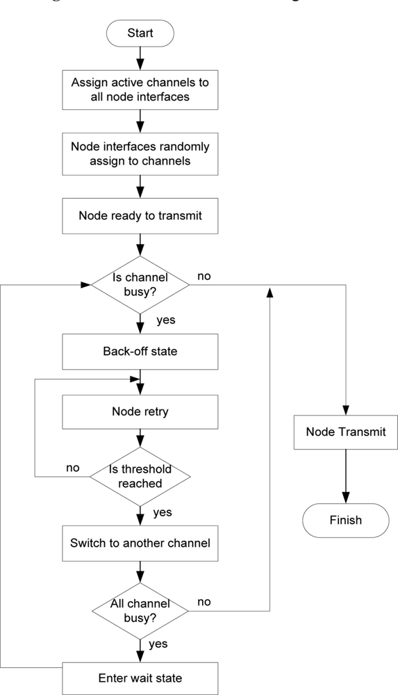 NS-2 is used as the simulation platform. At initialization, all nodes are made aware of the number of channels available through a channel notifier. When a node requires transferring data, the Carrier Sense (CS) mechanism is invoked in order to determine if the channel is busy or idled. If the CS is zero, this indicates that the channel is idled; otherwise the channel is busy and will be determined as transmitting data. During the backoff period of the original DCF, the contention window (CW) parameter will take an initial value of the control window (CWmin). The CW will take the next value in series every time an unsuccessful attempt to transmit causes the retry counter to increment. When the CW reaches maximum (CWmax), it will remain until the window is reset. In the proposal model the retry counter will reach its threshold after the third attempt and switch channel based on the design parameters. Nodes will enter wait state if all channels are busy.