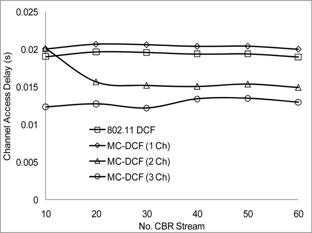 We now studied the impact of the number of non-overlapping channel in the 2.4 frequency band of the 802.11 network. We varied the number of CBR streams, node generate packets toward the sink node, with the option to switch channel base on the MC-DCF backoff algorithm criteria. In Figure 9 when channel load reaches about 30 CBR stream, there is not much effect as it relates to delay in 802.11 DCF and when MC-DCF uses 1 channel. Streaming too many data flow, using a single channel shows that the system becomes saturated from backing off and buffer overflow. MC-DCF and 802.11 DCF shows similar delay pattern. However having more than 1 channel show a reduction in delay in accessing the channel and with the channels coping with more load and after 45 CBR before becoming saturated.