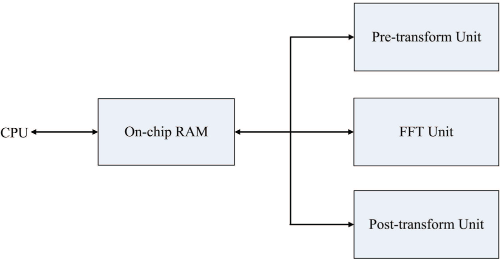 The objective of NIOS CPU is to control the data flow of the proposed architecture. Note that the on-chip RAM in the proposed architecture provides the source data for pre-transform unit, FFT unit and post-transform unit. The on-chip RAM also stores the computation results from these units. To ensure that the data in on-chip RAM is delivered to the correct unit, and the computation results of each unit can be sent to the on-chip RAM, the CPU is responsible for activating controller at each unit, and specifying the proper value in the status register in the on-chip RAM, which controls the multiplexer in the read and write ports of the memory.