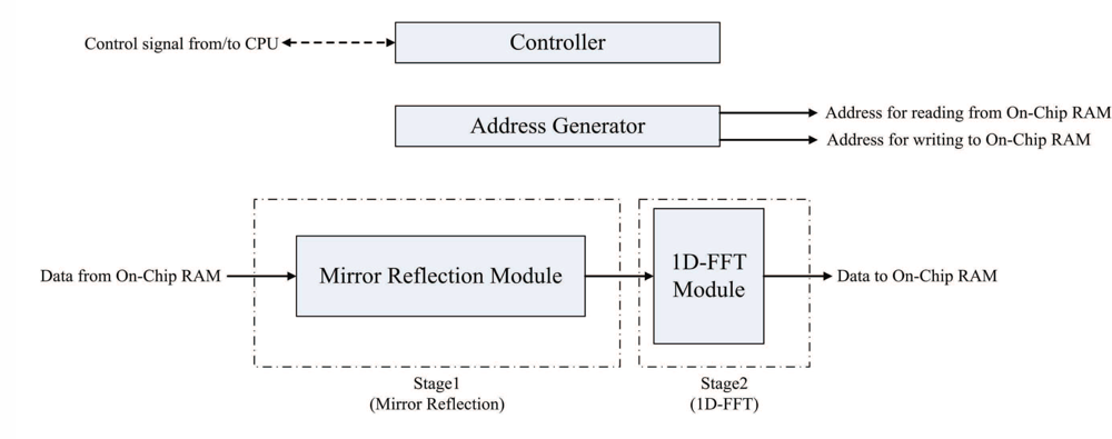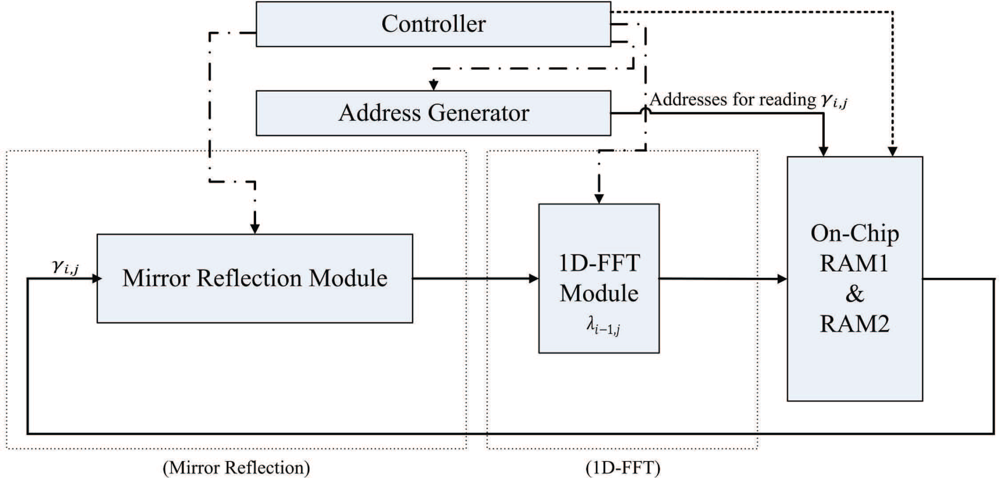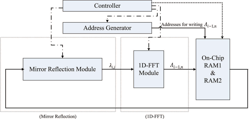 The FFT unit is employed for implementing Steps 2 and 4 of the algorithm. Figure 8 shows the architecture of the FFT unit, which contains controller, address generator, mirror reflection module and one-dimensional FFT (1D-FFT) module. The FFT unit reads the source data from both on-chip RAM 1 and RAM 2. The results produced by the FFT unit are then stored back to on-chip RAM 1 and RAM 2 to replace the source data.