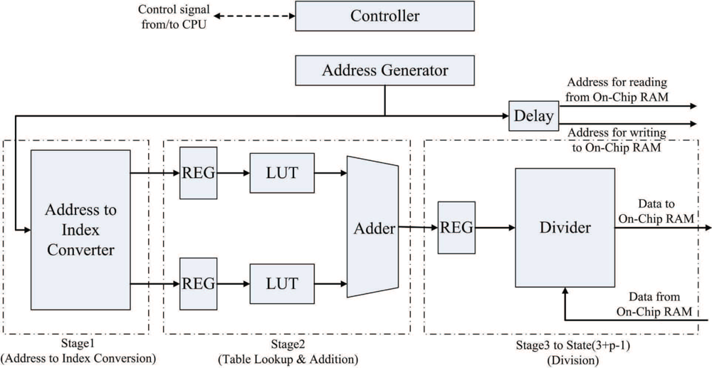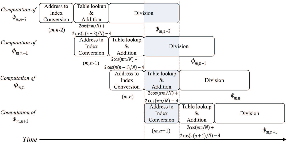 The post-transform unit is implemented as a (2 + p)-stage pipeline. As shown in Figure 12, the first stage performs the address to index conversion. That is, the address used for retrieving Γm,n from the on-chip RAM is used for computing indices m and n at this stage. The second stage of the pipeline computes cos(πm/N) and cos(πn/N) based on table look-up method. In addition, the second stage consists of an adder for computing (2 cos(πm/N) + 2 cos(πn/N) − 4). The third stage to the (2 + p)-th stage of the pipeline form a p-stage divider for computing Φm,n. Figure 15 shows the timing diagram for the pipeline operation of the post-transform unit. The input/output to each stage of the pipeline for the shaded time interval marked in the Figure 13 is then depicted in Figure 14.
