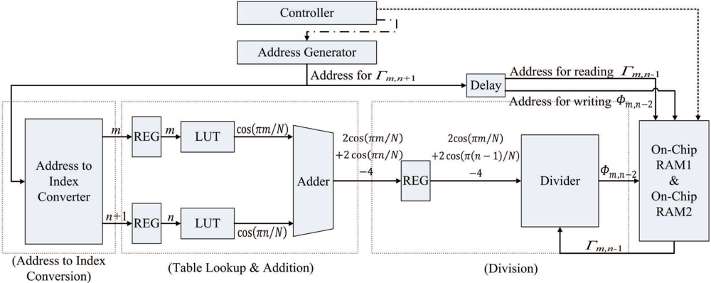 Given Γm,n in the on-chip memory, the post-transform unit operates as follows. The unit loads the FFT coefficients Γm,n from the on-chip memory one at a time based on the raster scan order. To reduce the amount of bus traffic, the address delivered to the on-chip memory for loading Γm,n is also delivered to the post-transform unit for extracting the indices m and n, which are then delivered to the cosine computation modules for finding cos(πm/N) and cos(πn/N). Both Γm,n loaded from the on-chip memory and (2 cos(πm/N) + 2 cos(πn/N) − 4) computed by the adders are then used as the input to the divider for computing Φm,n. The output of the divider is then stored directly back to the on-chip memory.