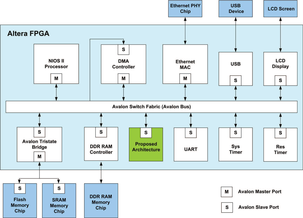 The proposed architecture is used as a custom user logic in a SOPC system consisting of softcore NIOS CPU [28], and the proposed architecture, as depicted in Figure 15.