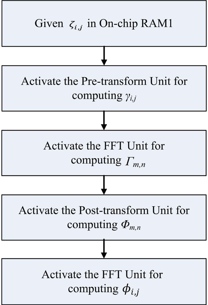 Note that the FFT unit is also used for the computation of inverse 2D-FFT of Φm,n. The data stored in the on-chip memory is Φm,n. The 1D-FFT module will operate as the 1D inverse FFT for the input data. The FFT unit will then produce ϕ̄i,j to the on-chip memory.