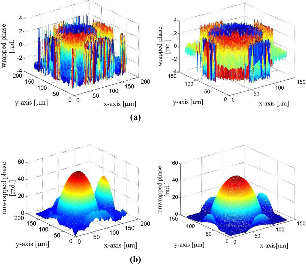 Figures 17 and 18 show the phase unwrapping results of the proposed architecture. The images considered in the experiments are produced by the DHMs in the IOP lab at the Institute of Electro-Optical Science and Technology, National Taiwan Normal University. In the experiments, microlens made by SUSSA (with radius of curvature 120 microns) are tested. The image resolution is 257 × 257 and 513 × 513 for the images shown in Figures 17 and 18, respectively. To evaluate the accuracy of the reconstruction, the radius of the curvature in the phase unwrapped results are measured, and are compared with the actual radius of the curvature of the microlens. The measured radius of curvature of the two microlens in Figure 17 are 121.0 and 121.1 microns, respectively. The measured radius of curvature of the microlen in Figure 18 is 119.7 microns. The maximum error of the unwrapped results therefore is only 1.1 microns for the measurement of radius of curvature.