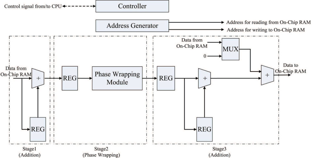 The goal of the pre-transform unit is to implement Step 1 of the algorithm in hardware. Figure 2 shows the architecture of the pre-transform unit, which consists of controller, address generator, registers, adders, phase wrapping unit, and multiplexer. The address generator is used to generate addresses for reading the source data from the on-chip memory, and writing the results to the on-chip memory. The registers are used for the implementation of pipeline for enhancing the throughput. As shown in Figure 2, there are three stages in the pipeline. The first and the third stages are adders. The second stage is the phase wrapping unit, which is employed to ensure that the values of and lie in the interval (−π, π].