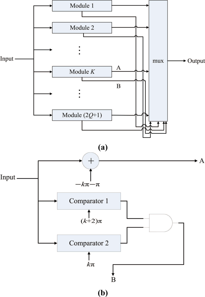 Figure 3 depicts the architecture of the phase wrapping unit, which contains 2Q + 1 modules. Each module i, i = 1, ..., 2Q + 1, contains two comparators for determining whether a phase difference computed by Equation (2) lies in the interval (−(2Q + 1)π + 2(i − 1)π, −(2Q + 1)π + 2iπ]. The phase difference is first broadcasted to all the modules. After the interval in which the phase difference lies is identified, the phase wrapping operation is then performed accordingly so that the resulting wrapped phase difference lies in (−π, π].