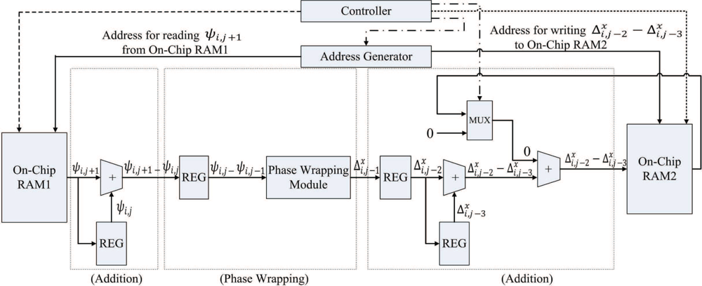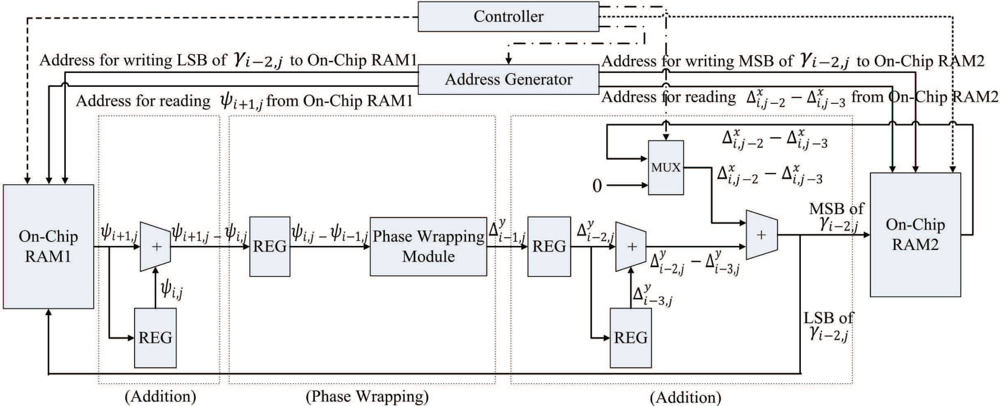 The on-chip memory consists of two identical RAM modules. Each RAM module is able to store an (N+1) × (N+1) array. The RAM modules are shared by all the units in the proposed architecture. They are used to store the original or intermediate results produced by each unit. These results will then be used as the source data for subsequent operations. The employment of the on-chip memory is able to significantly reduce the memory access time for phase unwrapping.