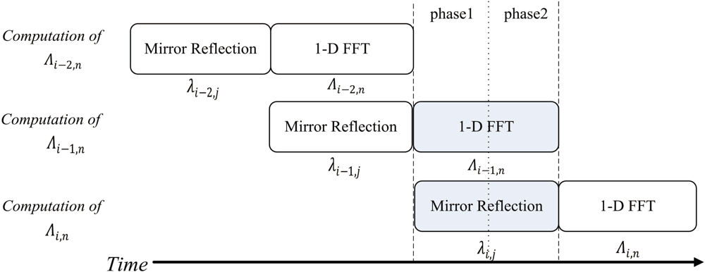 The FFT unit is able to operate as a two-stage pipeline, where the first stage is mirror reflection, and the second stage is 1D-FFT. Figure 9 shows the timing diagram for the pipeline operation of the FFT unit for the rows of the array γi,j. Note that the operation of each stage of FFT unit is separated into two phases. Both the stages will operate at the same phase at the same time. Figures 10 and 11 show the operation of phase 1 and phase 2 at each stage, respectively. As shown in Figure 10, at the phase 1 of the mirror reflection, a row of γi,j (e.g., i-th row) is loaded from on-chip RAM for computing λi,j, 0 ≤ j < 2N. At the same time, the phase 1 of 1D-FFT module uses λi−1,j, 0 ≤ j < 2N as the input for computing Λi−1,n, 0 ≤ n < 2N. The mirror reflection module then delivers λi,j, 0 ≤ j < 2N to the 1D-FFT module at its phase 2 operation. At the same time, the 1D-FFT module sends the Λi−1,n, 0 ≤ n < N, to the on-chip RAM, as depicted in Figure 11.