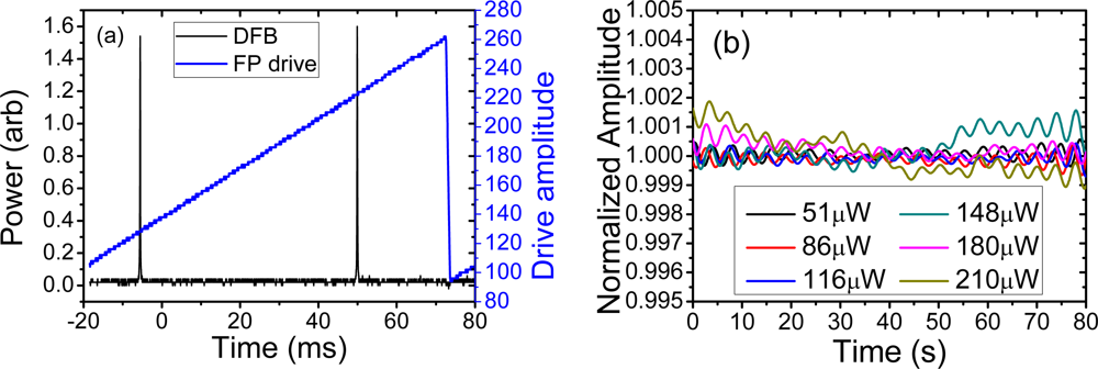 The DFB laser used in these experiments was fabricated by direct writing with a continuous-wave 244 nm from a frequency doubled Ar+ laser into an Er3+ doped germanosilicate fiber. The phase-shifted grating is 55 mm long with an off-centre phase shift designed to preferentially direct single polarisation laser output from one side. The laser was mounted on an aluminum block and covered in heat conductive paste. It was pumped with a 976 nm grating stabilized laser diode, and the DFB fibre laser output wavelength measured to be λ ∼ 1,547 nm. The longitudinal mode profile was characterized using a scanning Fabry-Perot (FP), shown in Figure 1(a)—this confirmed that the laser was robustly operating on one linear polarization eigenstate. In order to estimate the degree of intrinsic laser signal variation, the amplitude variations in the DFB output were measured on an oscilloscope and are shown for varying power levels in Figure 1(b). For the highest output power used, the variation in the power of the DFB was measured to be <0.2% indicating a well fabricated, stable single polarization longitudinal mode DFB laser, an ideal source for comparing the interferometers.