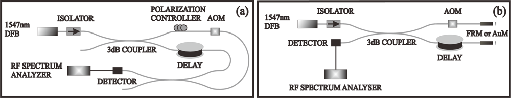 In the Michelson configuration (Figure 2(b)), the second 2 × 2 coupler is removed and the two arms are terminated with either FRMs or straight gold coated mirrored fibre ends. The FRM is expected to compensate for arbitrary rotations in the polarization eigenstates in the two arms and the two beams recombine at the 2 × 2 coupler at the same polarization state as each other but rotated 90° from the initial state of polarization [11]. The delay coil used in the MI configuration is l = 21 km, which gives an effective length of l = 42 km for the MI, comparable to the delay length of the MZI. The frequency shift in the other arm in this case is also doubled to f = 54.24 MHz with the return trip.