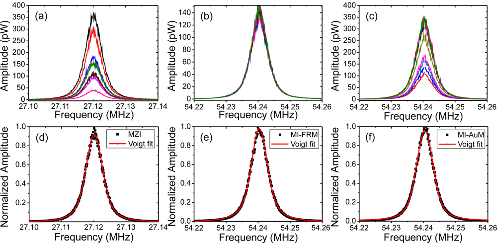 The beat spectra were recorded for six power levels of the DFB laser with each measurement averaged 100 times, taking ∼7 min to complete. A total of 10 measurements were taken within a minute of each other at each power level for both interferometers to reduce uncertainty and ensure statistical reliability and reproducibility. The FRMs of the MI were replaced with gold-coated mirrors (AuM) and the measurements were repeated for comparison. The beat spectra obtained for the resolution bandwidth (RBW) setting of 10 Hz are shown in Figure 3(a–c) for the MZI and MI-FRM and MI-AuM, respectively. Only three out of a total of 18 sets acquired are shown for the sake of clarity. The amplitude variations in the beat spectra observed for the MZI and the MI-AuM (Figure 3(a,c)) is a direct result of random variations in the polarization state of the two arms with respect to each other during the course of the measurements. This was evident despite the MZI and the MI-AuM being inside a soundproof enclosure and placed on an actively vibration stabilized table and the polarization state adjusted at the beginning of the first measurement (for each power level). The use of FRMs in the MI compensates for variations in polarization and produces consistent and repeatable beat spectra, as seen in Figure 3(b).