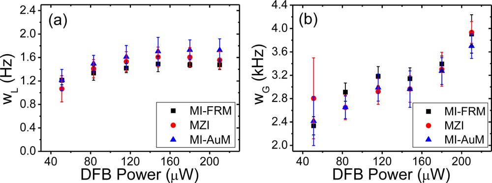 The Gaussian linewidth, wG, on the other hand, continues to increase with increasing power with measurements for both interferometers suffering relatively large measurement errors over the full range. However, the measurement error in the MI-FRM is still lower than the MZI for all measurements, except for the last measurement for 210 μW DFB power. The steady increase in the Gaussian linewidth is attributed to thermal fluctuations inside the DFB caused by increasing pump power. The spectral mismatch of the pump laser used (λ = 976 nm) to the Er3+ absorption line could have further exacerbated the pump dependence of the frequency noise of the DFB laser. The larger measurement error in the extracted Gaussian linewidth is attributed to the fundamental thermal noise sources listed above and the random nature of such noises.