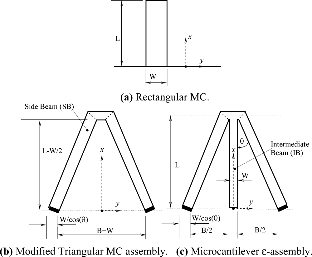 The magnitude of microcantilever deflection is of the order of nanomenters and it is usually measured using optical methods. The performance of the microcantilever as a sensing device is affected by the noise level in the surrounding environment. For example, Fritz et al. [12] reported that the microcantilever deflection due to flow disturbances and due to thermal effects could reach 5–10 times that due to analyte sensing. Accordingly, further developments in microcantilever technology are necessary in order to magnify the deflection signal due to the sensing effect so that its signal can be easily distinguished from the noise signal [13–16]. As such, Khaled et al. [2] pointed out the necessity of establishing special microcantilevers assemblies for this purpose. Many of these assemblies were patented [14,17]. It should be noted that additional novel methods for magnifying the deflection signal due to analyte sensing were proposed [18–21]. Some of these methods are based on controlling both the geometry of the fluidic cell incubating the microcantilevers and their geometrical distribution. An interesting assembly among the assemblies described in the work of Khaled et al. [2] is the ɛ-microcantilever assembly. The deflection due to analyte sensing of ɛ-microcantilever assembly is estimated to be double that of the rectangular microcantilever [2]. As such, this assembly is considered to be highly important for the present work.