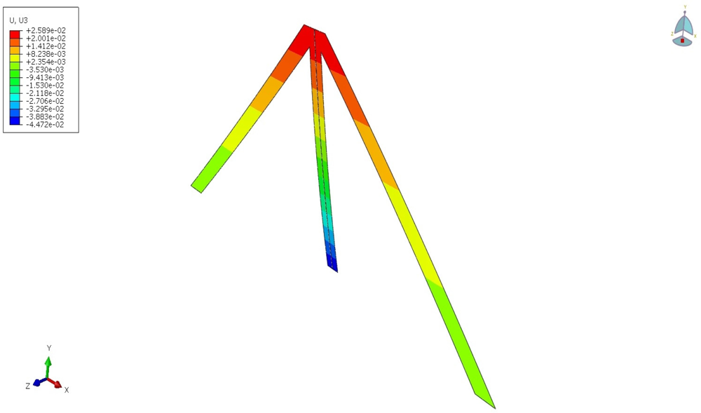 The present analytical methods were tested against an accurate numerical solution using finite element methods and accounting for all mechanical constraints induced by the assemblies. Among these constraints is restraining the wrapping of the side beams due to the presence of the small connecting beam at x = L. The deflection contours for assembly (c) with L = 385 μm, W = 30 μm and t = 20 nm under concentrated moment condition described in section 2.2.2 with M = 10−12 Nμm is shown in Figure 2. The microcantilever material was taken to be silicon with E = 0.185 Nμm−2 and a poisons ratio of ν = 0.33. The assembly deflection at x = L is equal to zcM (x = L) = 0.028 μm using Equation (36b). Also, the deflection at the intermediate beam’s free end can be shown to be equal to zcIBM (x = 0) = 0.048 μm. As can be seen from Figure 2, the corresponding numerical values of those deflections are equal to 0.026 μm and 0.045 μm, respectively. Notice that the maximum error between the numerical and the derived analytical solutions is less than 10 percent. Also, notice that the numerical values of deflections are smaller than those predicated by the analytical methods. This is because the geometrical constraints imposed on the assemblies impede the deflections. (Legand)