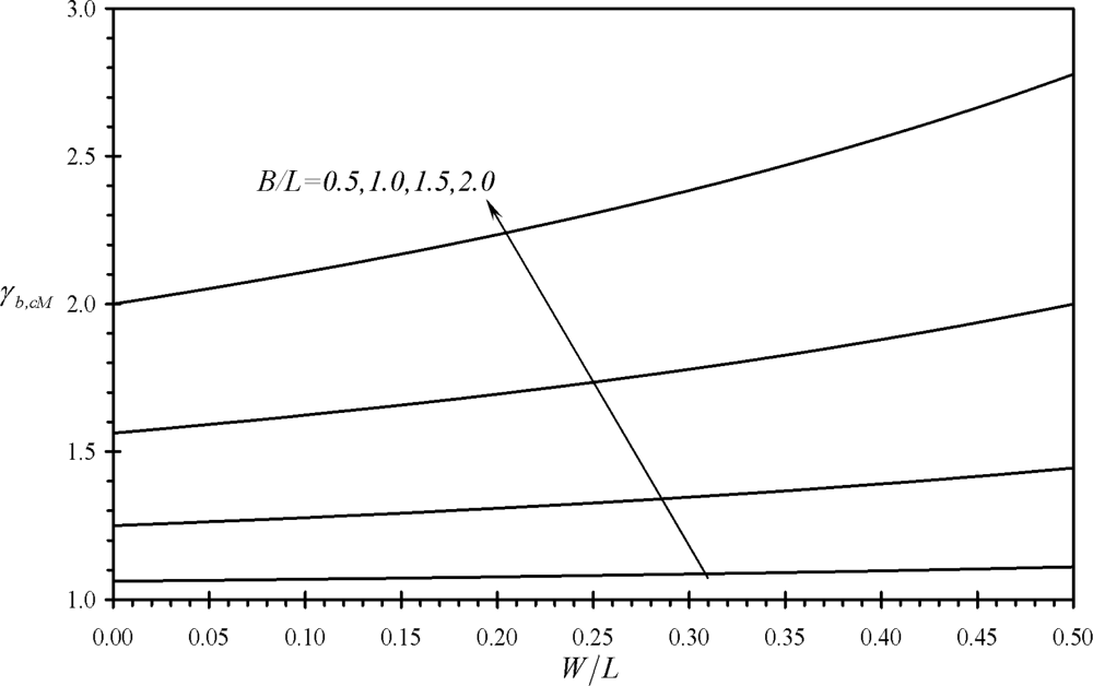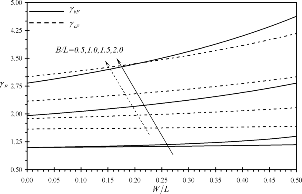 Figure 3 shows the variation of the performance indicators γbF and γcF with the relative dimensions of assemblies (b) and (c). It is noticed that all the values of γbF and γcF are larger than one which indicates that assemblies (b) and (c) produce larger deflections than rectangular microcantilevers under same surface stress at the base and same extension length L. Moreover, both indicators increase as both the microcantilever width W and the assembly width B increase. Similar findings are noticed for the performance indicators γbM, γcM, γbΔσ and γcΔσ as can be seen from Figures 4 and 5. On the other hand, an increase in B causes the effective free length of the assembly to increase, which makes the assembly more sensitive to external noises.