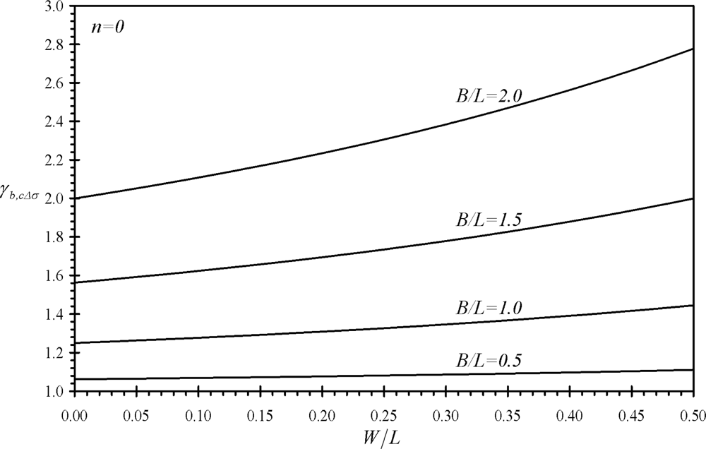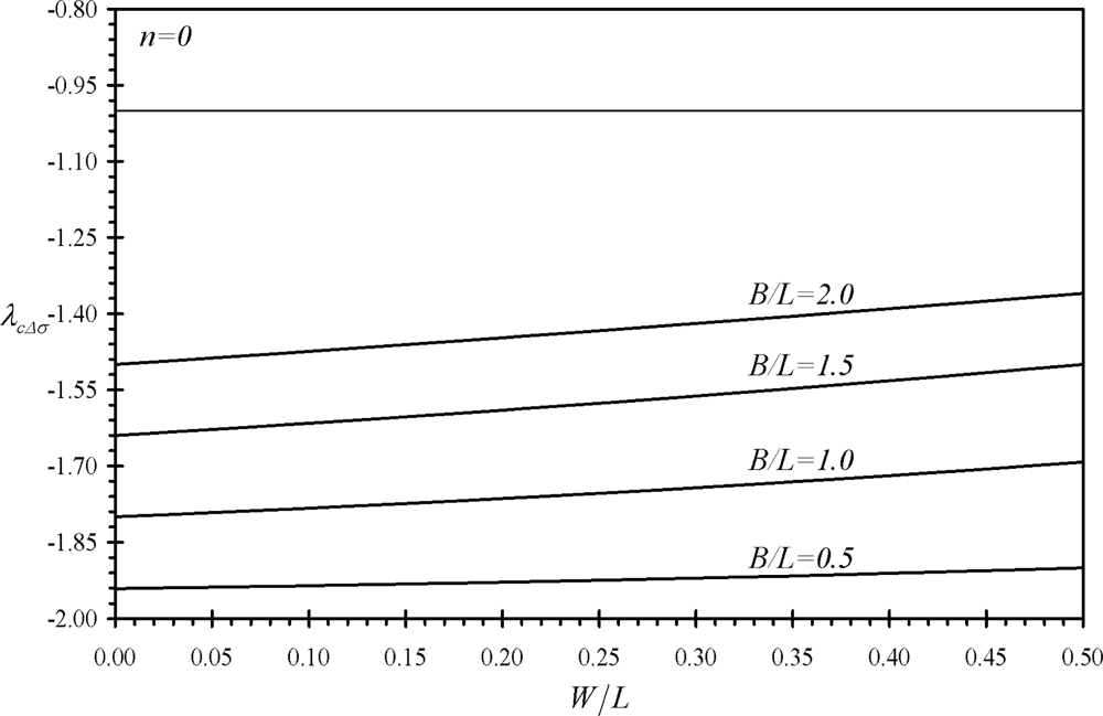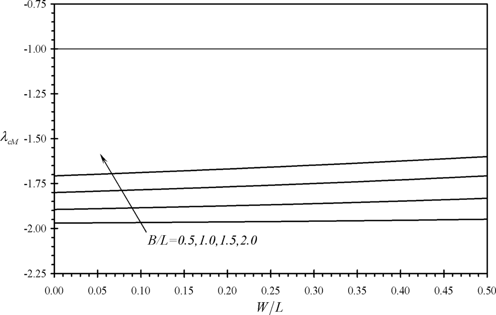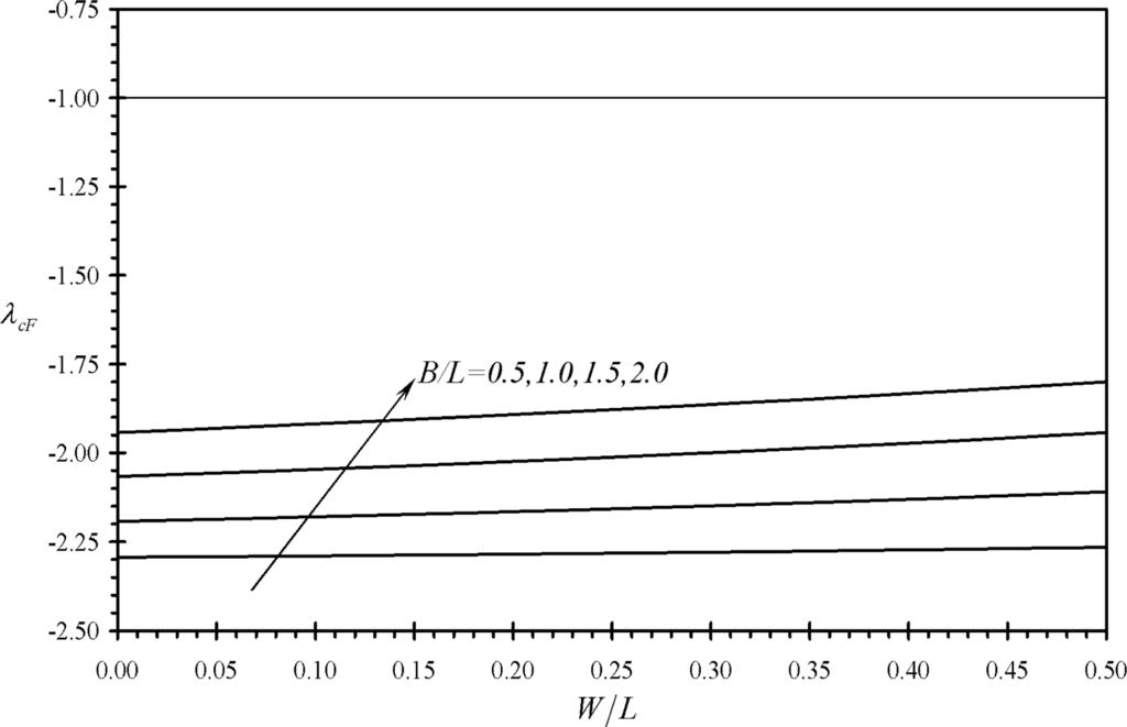 Figure 6 shows the variation of the second performance indicator λcF with the relative dimensions of assembly (c). It is noticed that all values of λcF are smaller than minus one. This indicates that IB-free end deflection is always larger than that of the assembly tip deflection. Moreover, the absolute value of λcF is noticed to increases as both W and B decreases. Similar findings are noticed for the performance indicators λcM and λcΔσ as can be seen from Figures 7 and 8. As a result, assembly (c) can provide larger deflections than assembly (b) while it is less affected by external noise. This is because its deflection increase as B decreases which results in a reduction of the assembly’s free length. Moreover, the absolute values of λcΔσ increases as n increases as can be shown using Equation (41). This indicates the advantage of assembly (c) in microsensing applications as compared to rectangular cantilevers or triangular cantilevers.