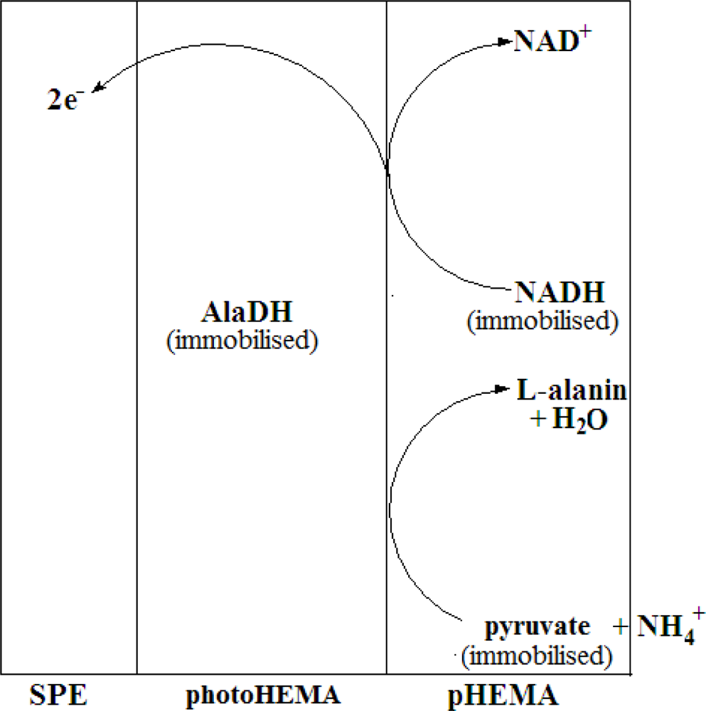 To construct the stacked membrane biosensor, AlaDH enzyme was first entrapped in the photoHEMA membrane, whereby the membrane with the entrapped enzyme was formed via UV photopolymerisation of 2-hydroxylethyl methacrylate monomer. Past studies have shown that the use of photoHEMA is compatible with many enzymes without leaching problems. To further immobilize the pyruvate and NADH, a low molecular weight poly(2-hydroxylethyl methacrylate) (pHEMA) membrane containing both of these substances was cast on top of the enzyme membrane after photocuring. The use of this second membrane allowed both pyruvate and NADH to be immobilized but their free diffusion in the membrane would also be ensured to maintain a rapid reaction rate. The biosensor was thus designed to provide a reagentless system specific for NH4+ ion. Figure 1 represents the mechanism of the enzymic reaction involved in the developed NH4+ ion biosensor based on a stacked membrane system.