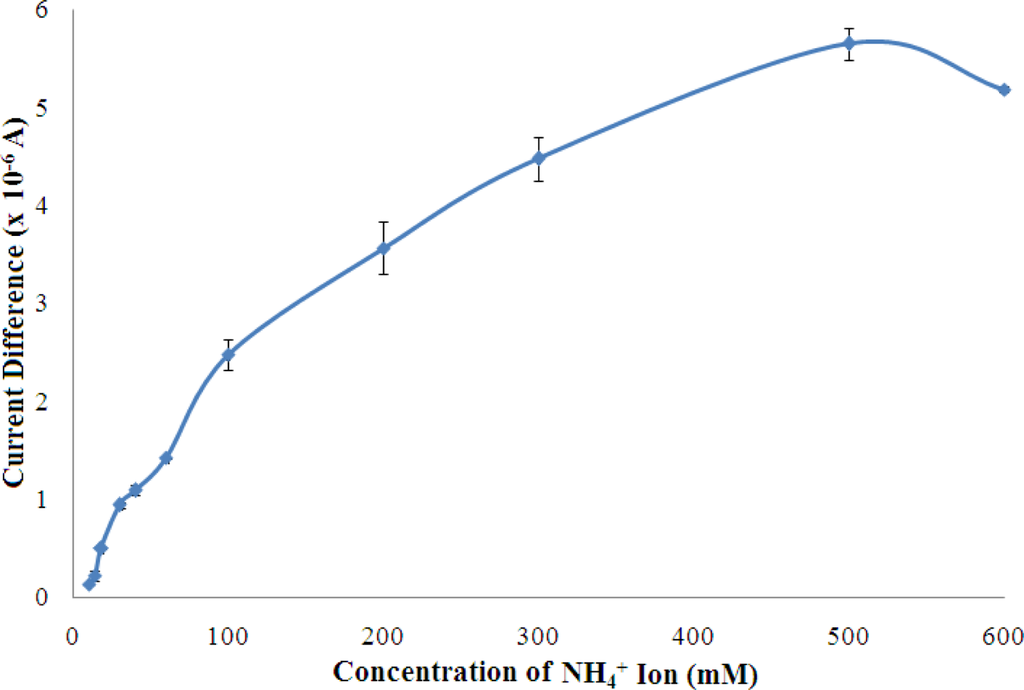 The response of the biosensor was examined from 10–600 mM of NH4+ ion and the results are shown in Figure 10.