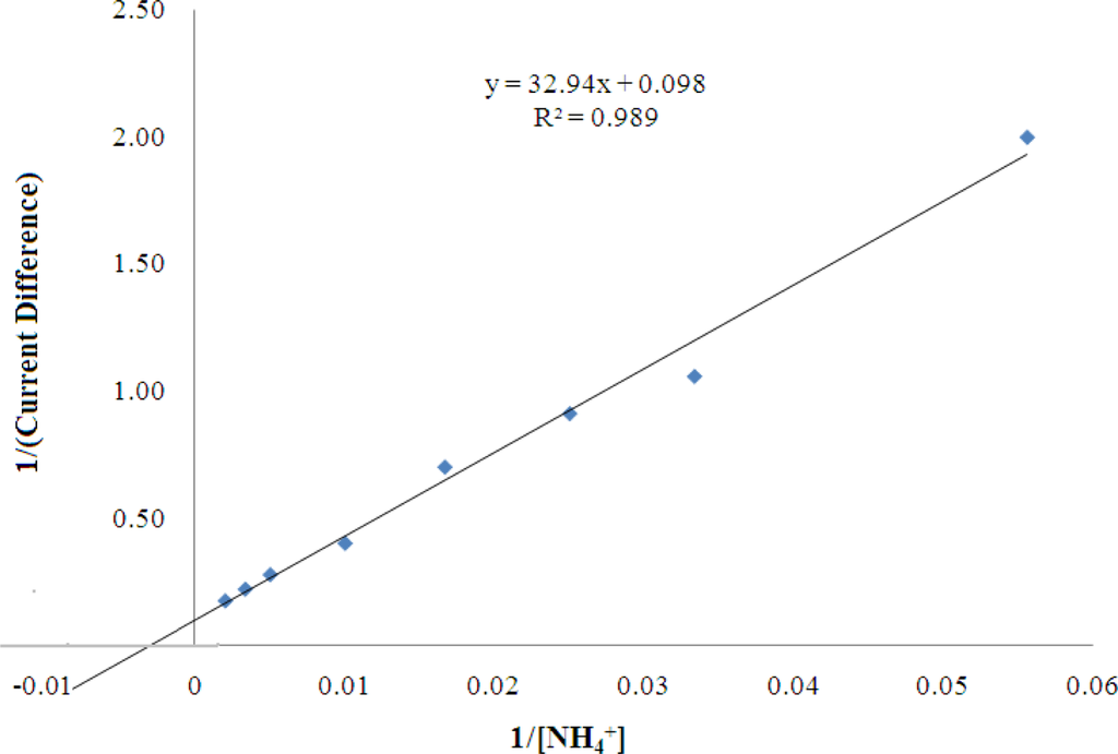 The biosensor sensor response was found increased with increasing NH4+ ion concentration from 10–500 mM, and reached saturation beyond 500 mM NH4+ ion. This phenomenon is due to the fact that available pyruvate, cofactor NADH, and enzyme active sites have been gradually consumed with increasing NH4+ ion concentration until a saturation condition is achieved. Furthermore, at high levels of NH4+ ion, the ionic strength of the reaction medium increases and thereby reduces the enzymatic reaction which is also influenced by the charge at the enzyme active sites. A linear response range was observed at 10–100 mM (R2 = 0.978, n = 7) with a limit of detection of 0.18 mM. The apparent Km value estimated from the Lineweaver-Burk plot was 34.01 mM (Figure 11).