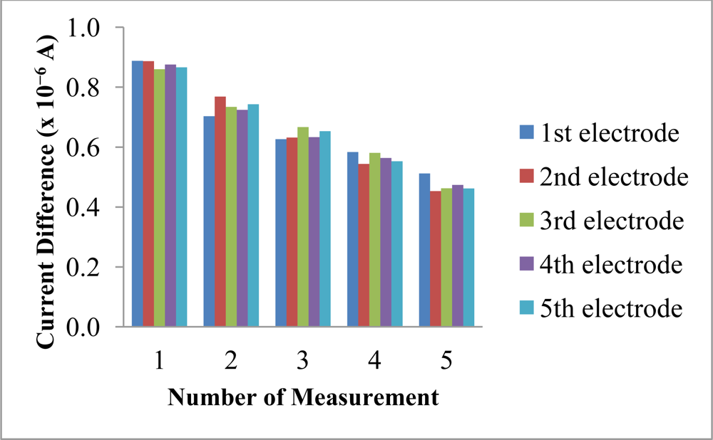 The reproducibility and repeatability of the reagentless biosensor was evaluated at 30 mM NH4+ ion. The current difference measurements obtained using different electrodes gave low RSD values from 1.4–4.9% (n = 5). These values were low enough to consider that the membranes were reproducible as fabricated by the proposed method. However, the slightly higher repeatability RSD values (21.7–26.4%, n = 5) obtained using the same biosensor was attributed to the irreversible oxidation of immobilized NADH at the electrode surface, which resulted in a decreasing current difference being observed for five consecutive measurements over the same electrode (Figure 12). The poor repeatability is an inherent effect from the leaching of the immobilized NADH and pyruvate. Both of these reactants are deliberately allowed to leach out from the membrane in order for them to diffuse into the enzymatic membrane to react with the AlaDH enzyme. Therefore, the poor repeatability is attributed to the loss and consumption of these reactants when the biosensor is reused many times. The biosensor is mainly used for on-site analysis and because it is made from SPE that can be manufactured at low cost, thus one can aim for a single-use and disposable electrode.