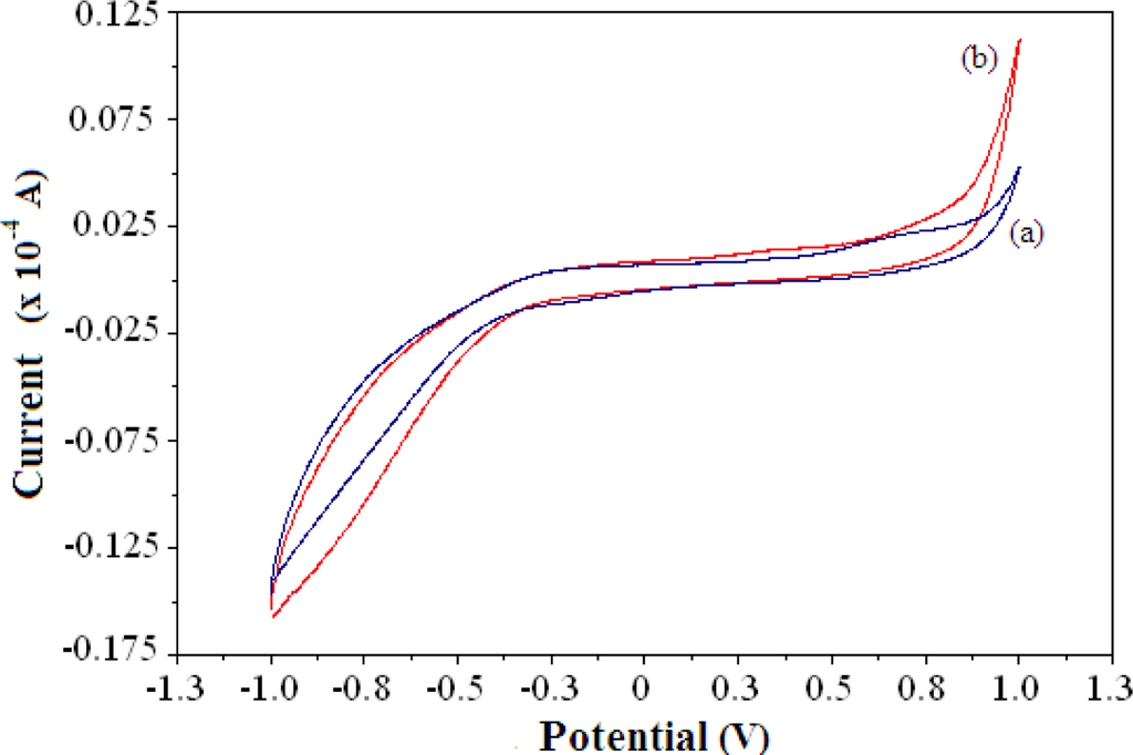 Due to the enzymatic reaction of AlaDH and the pyruvate substrate, the signal from the electrocatalytic oxidation of NADH was proportional to the NH4+ ion concentration. Figure 2 shows a typical cyclic voltammogram of the reagentless NH4+ ion biosensor demonstrating the electrocatalytic activity of biosensor in the absence and presence of 100 mM NH4+ ion. The oxidation current of the biosensor increases after NH4+ ion addition in the positive potential region. Although no clearly defined cyclic voltammetric peak appears, the biosensor shows an increase in current in response to NH4+ ion in the potential range of 0.4–0.9, as indicated by the cyclic voltammogram.