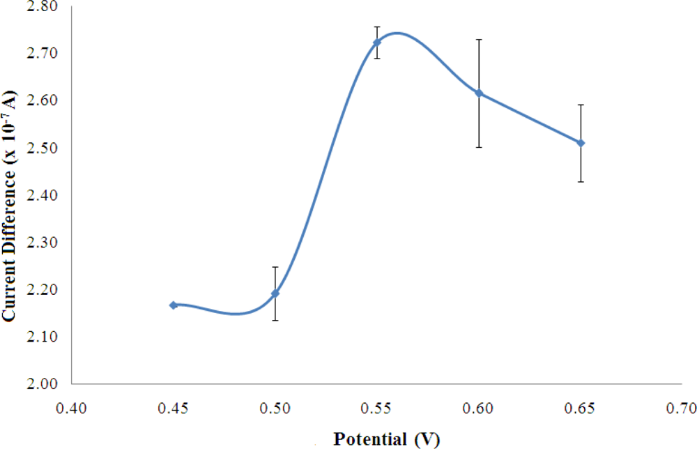 Figure 3 shows the biosensor response of a fixed amount of NH4+ ion when the potential was varied between 0.45–0.65 V and optimum applied potential was observed at +0.55 V, where the highest current was obtained. The working potential was found like the NADH oxidation potential using a 4,6-diamino-2-mercaptopyrimidine modified gold (Au) electrode [25] and a thiocytosine modified Au electrode [26]. However, the oxidation of NADH at +0.55 V was found lower compared to the electrochemical oxidation of NADH employing boron-doped diamond electrode (+0.58 V) [27]. The potential of +0.55 V was used in this work for the amperometric detection of NH4+ ion.