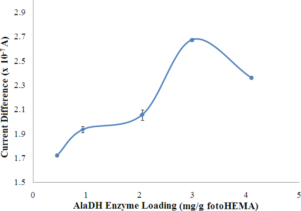 The effect of enzyme loading on the biosensor response is shown in Figure 5. The response increased with increasing AlaDH enzyme loading in the membrane until saturation was achieved at an enzyme loading of 2.98 mg AlaDH/g fotoHEMA. However, the response was lower after this optimal loading.