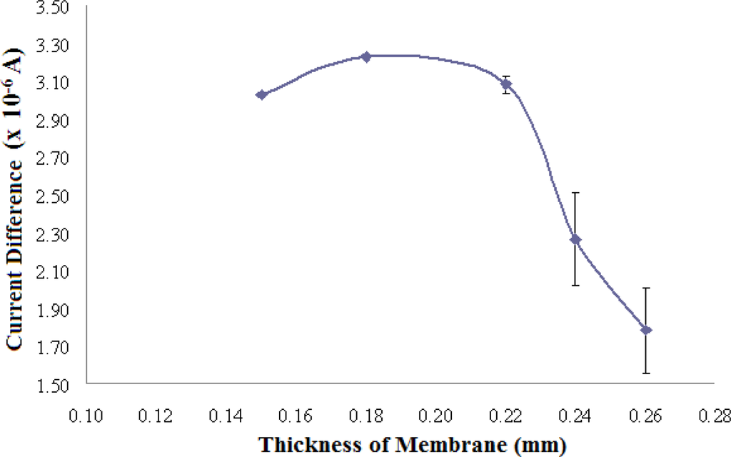 The effect of the thickness of photoHEMA membranes containing 2.98 mg AlaDH/g photo HEMA on the biosensor response is presented in Figure 6. The optimum thickness of AlaDH enzyme-containing photoHEMA membrane was found to be 0.18 mm because of the consistent high signal attained for the same NH4+ ion concentration (RSD = 5.6%). A membrane thickness of 0.15 mm gave a slightly lower response due to the low reproducibility of preparing a thin membrane (RSD = 14.2%). Moreover, a thin membrane may lead to the leaching out of the immobilized enzyme. Thicker membranes, between 0.22–0.26 mm, gave inconsistently low responses as these membranes resulted in the active sites of the enzyme becoming less accessible, in addition to hindering the diffusion of rectants and products.