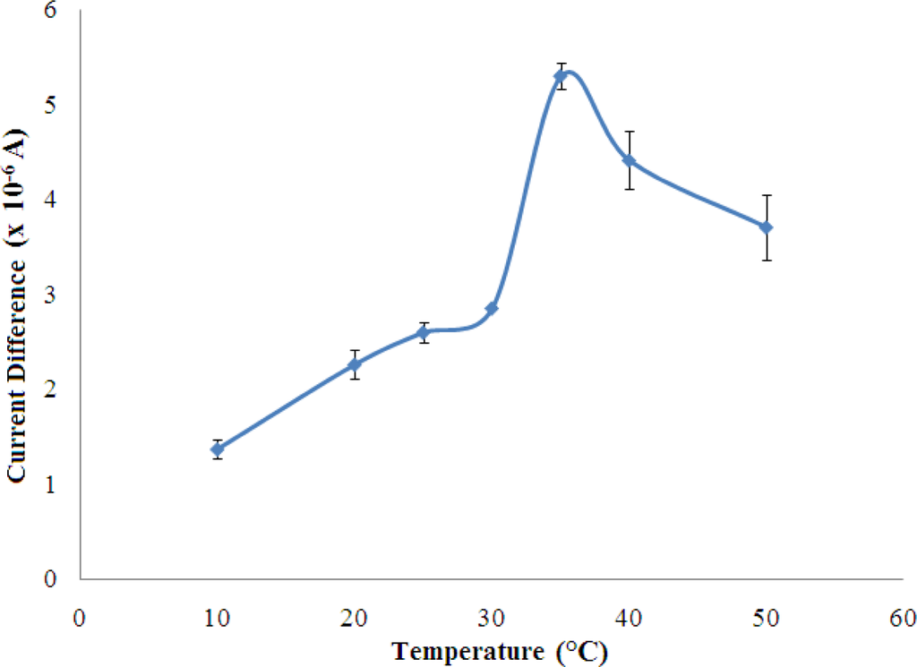 Biosensor response to temperature changes in the 10–50 °C range was determined by varing the temperature of the electrolyte solution in a thermostatic bath. For this study, about 21 biosensors were prepared a day before and stored overnight at 4 °C before testing was performed.