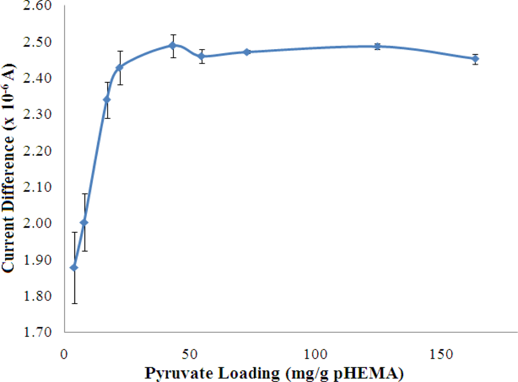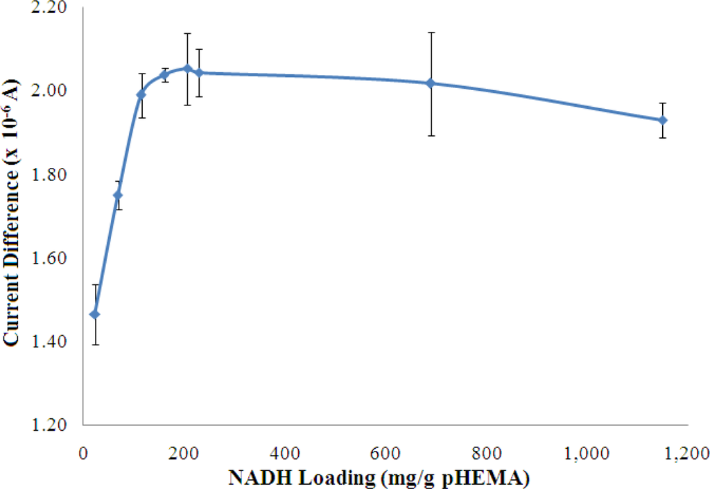 The concentrations of both pyruvate and NADH, which were immobilized in the pHEMA membrane were optimized to yield the best biosensor response to NH4+ ion. The results are shown in Figures 8 and 9, which indicate that the current response increases with increasing pyruvate and NADH loadings and becomes saturated at loadings of 42.99 mg pyruvate/g pHEMA and 160.87 mg NADH/g pHEMA, respectively.