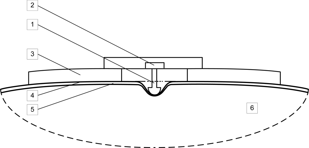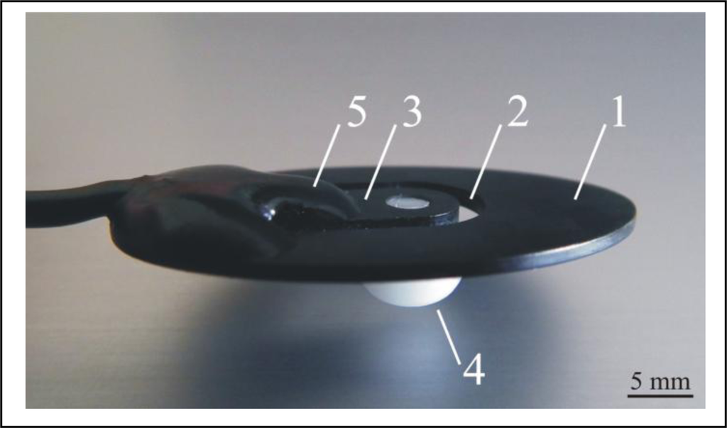The elliptically shaped carbon fibre reinforced epoxy polymer (1) was used as the supporting part. A specially shaped incision (2) formed a tonguelet (3), to which the sensor tip (4) was attached (screwed in). Area of the part of the MC sensor, attached to the skin was 650 mm2. Area of the sensor tip, applying pressure to the skin was 56 mm2. A piezoresistive strain gauge (5) was attached at the root of the tonguelet using a suitable adhesive. As the strain at the root of the tonguelet was proportional to the force acting on the sensor tip, the resistance of the piezoresistor was proportional to that force. To compensate for the temperature sensitivity of the semiconductor strain gauge, the resistance was measured with four piezoresistors connected in a Wheatstone bridge such that all four resistors were placed closely together at the same temperature.