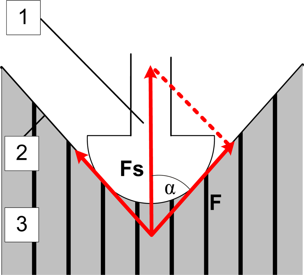 The measured muscle tension produces the force F in the direction along the muscle surface. This force causes the intermediate layer and skin to press on the sensor tip. The vector sum of all forces produces the force Fs in the direction along the sensor tip. This force is then measured with the force meter. In the simplified 2D model presented in Figure 2, this force would be equal to: