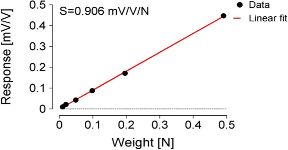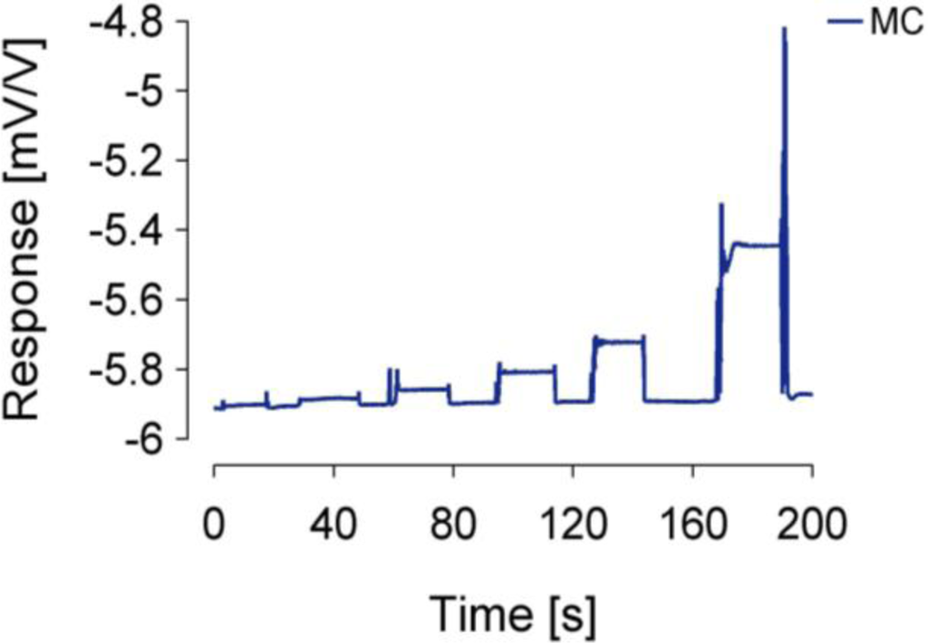 The concrete MC sensor implementation output response (in mV/V), measured at six different weights (1, 2, 5, 10, 20, and 50 g), is presented in Figure 4. The artefacts were caused during manual weights exchanges on the tonguelet. Figure 5 shows that the sensitivity of the MC sensor was S = 0.906 mV/V/N.