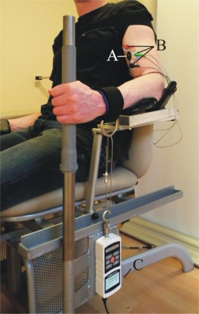 The measurements were performed on the biceps brachii (BB) muscle under isometric conditions (elbow angle 90°), as shown in Figure 6.