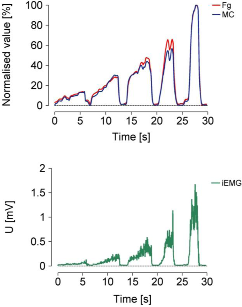 We observed that the normalised MC and Fg (top) values matched closely; this indicates that the response of the MC sensor is nearly linear. The timing of iEMG and MC also matched closely, which indicates that the dynamic behaviour of the MC sensor is comparable to the dynamic behaviour of EMG.