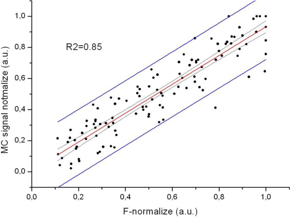 This high individual linear correlation between the force and MC signals was confirmed in each measured subject under isometric conditions. The MC signal was recorded on the biceps brachii muscle. Each calculated r value was between 0.97 and 1. The coefficient of determination, which was calculated to assess the strength of the linear relationship between the force and MC signal for all subjects, was 0.85. Figure 8 shows the normalised Fg-MC signal relationship with a 95% confidence level.
