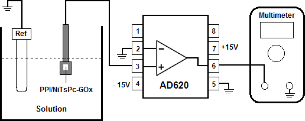 The FET-based biosensor device was composed of a biochemically sensitive membrane formed by PPI/NiTsPc-GOx as enzyme separative extended gate, connected to a commercial AD620 amplifier used here as unit gain buffer. The biomembrane was immersed in a phosphate buffer solution (10 mM, pH 7.5) and glucose aliquots were then added in the measurement cell to determine the glucose sensing characteristics. For the measurements of the time dependence on the output voltage we used a Ag/AgCl/Sat-KCl reference electrode to support a constant voltage. The AD620 output voltage was recorded using a Keithley 195A multimeter. Figure 1 illustrates the FET-based biosensor structure and the measurement system, showing the connection diagram of the instrumentation amplifier AD620.